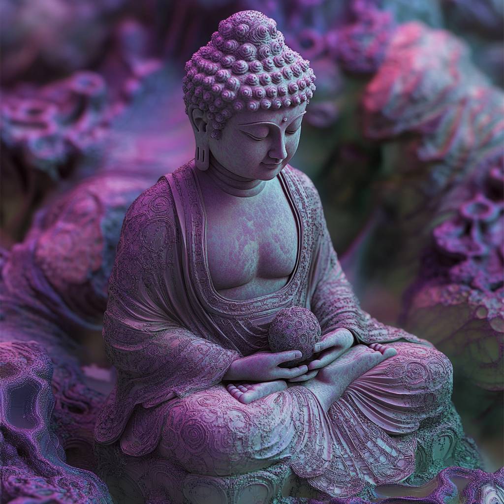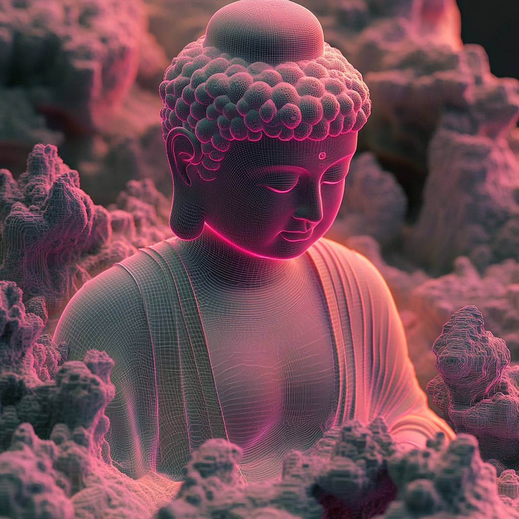 A serene Buddha statue in HoloEtherealDigitalGrids style, on a canvas of lavender and sage green, surrounded by neon fractals --style raw --s 250