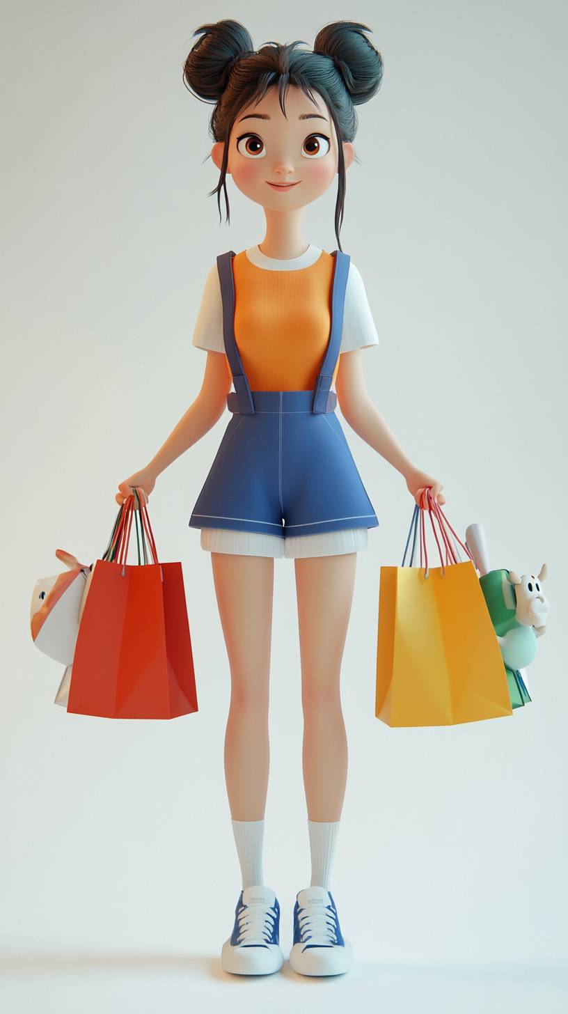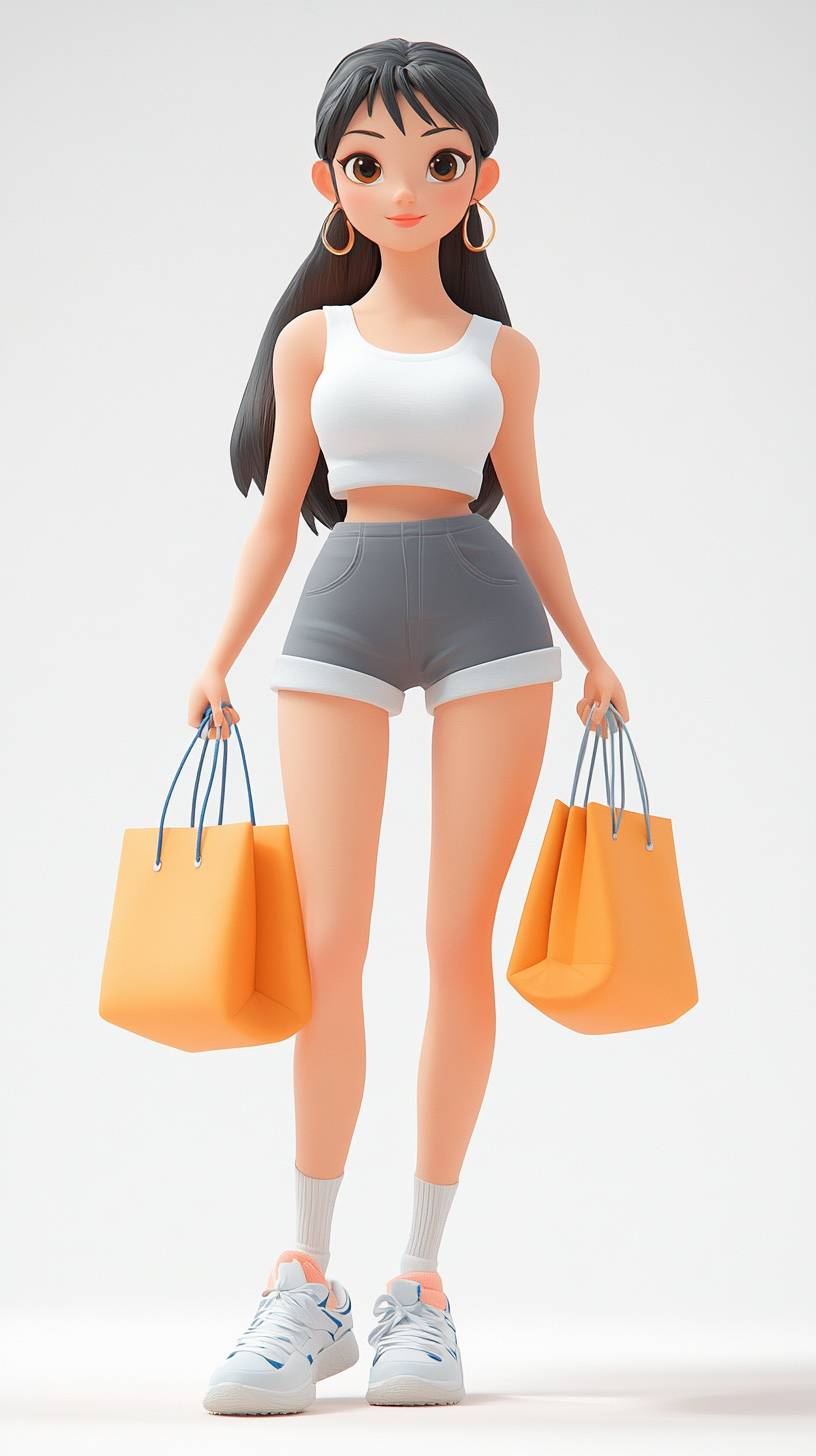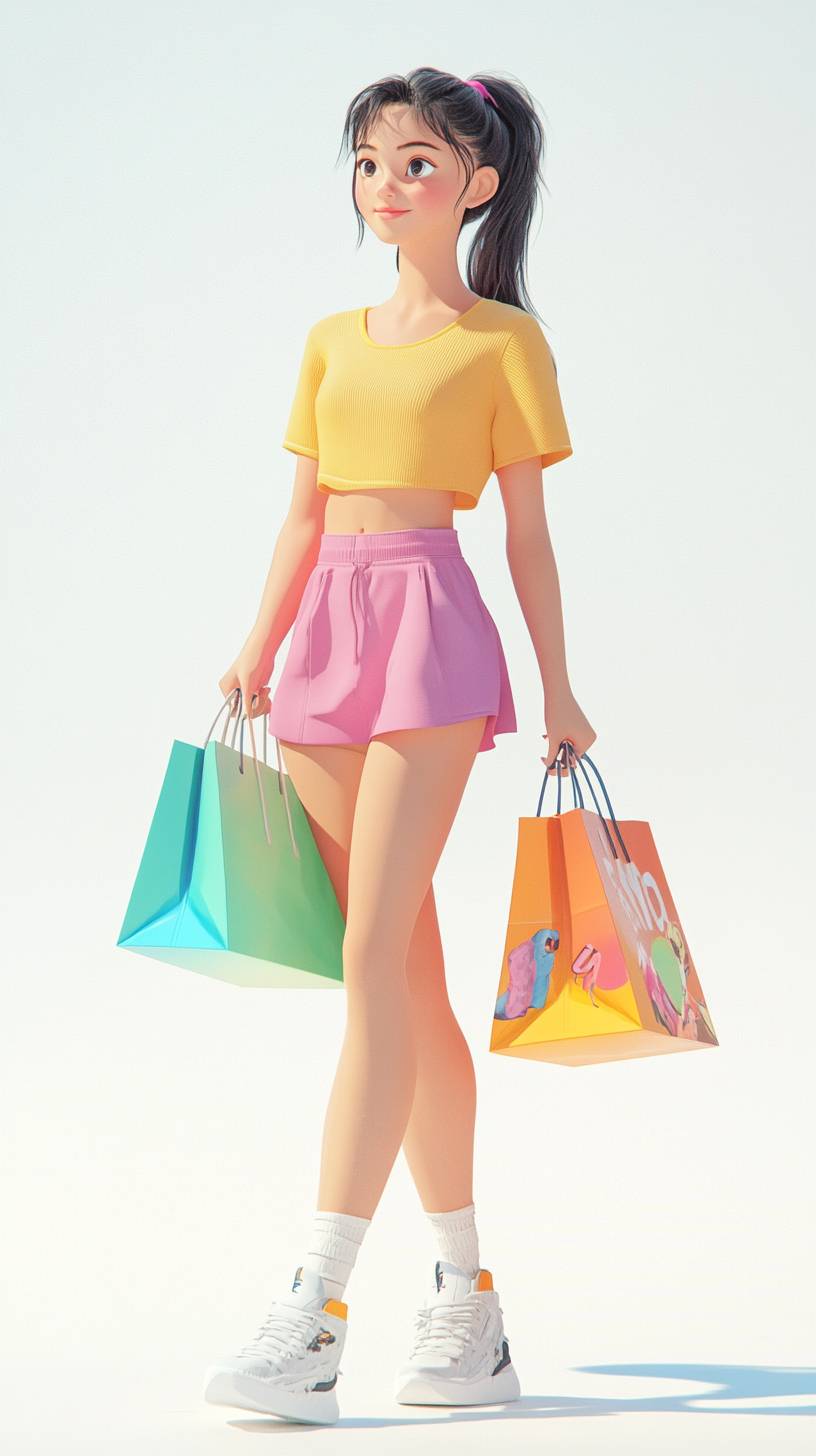 Asian women,Carrying shopping bags,bold character design,Various actions,Multiple colors,Sportswear,Short sleeve,skirt,Summer Clothing ,whole body,front, sports, Laser Material,white background, Pixar, clay material, soft colors, studio lighting, octane render, blender, ultra high quality, ultra high definition, 8K, vivid brushstrokes --ar 9:16 --v 6.1