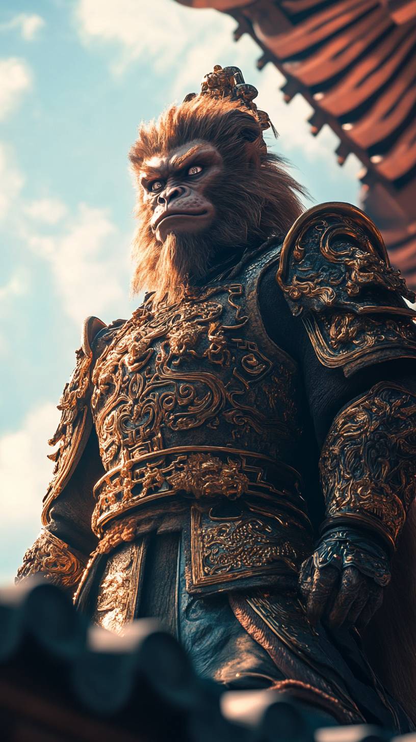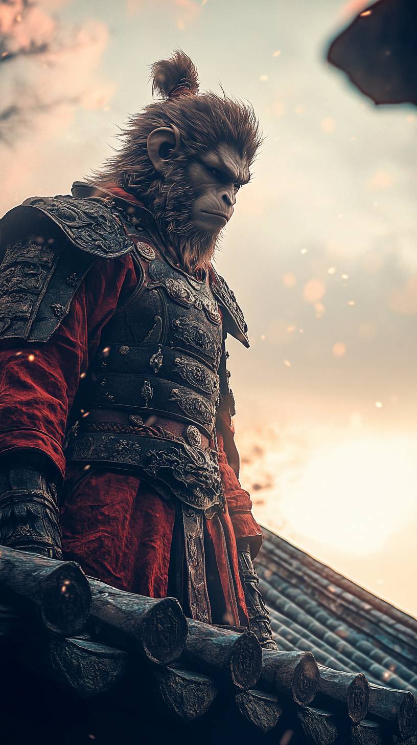 A Monkey King wearing armor stood on the roof of an ancient Chinese palace, looking majestically into the distance.anime style, Hyperrealism, cinematic lighting, backlighting, film grain, halftone, lens flare, lens flare, bokeh, from below --ar 9:16 --stylize 250 --v 6.1