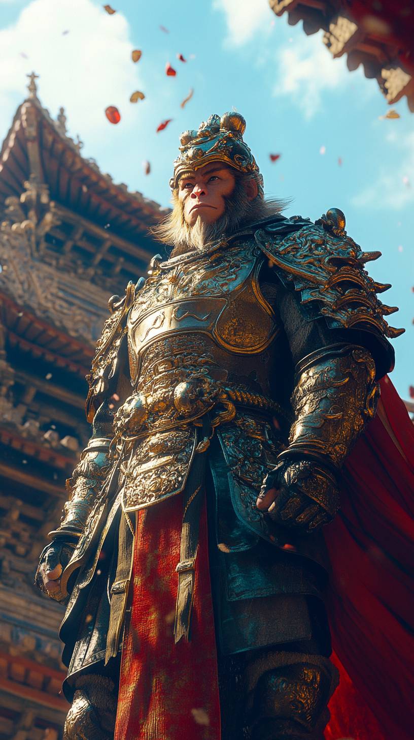 ملك القردة يرتدي درعًا واقفًا على سطح قصر صيني قديم، ينظر بشكل مهيب إلى المسافة.