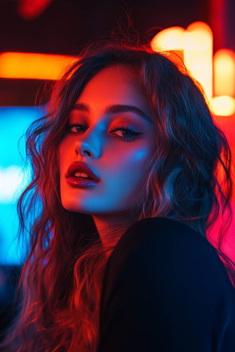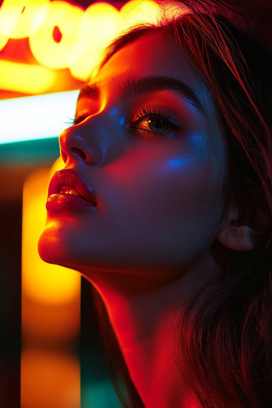 Photograph of a beautiful woman in the style of Ektachrome, with a dreamy, expressionist portraiture style. The setting is a night club, with neon lights and high contrast. It is a close-up shot --v 6.1 --ar 2:3