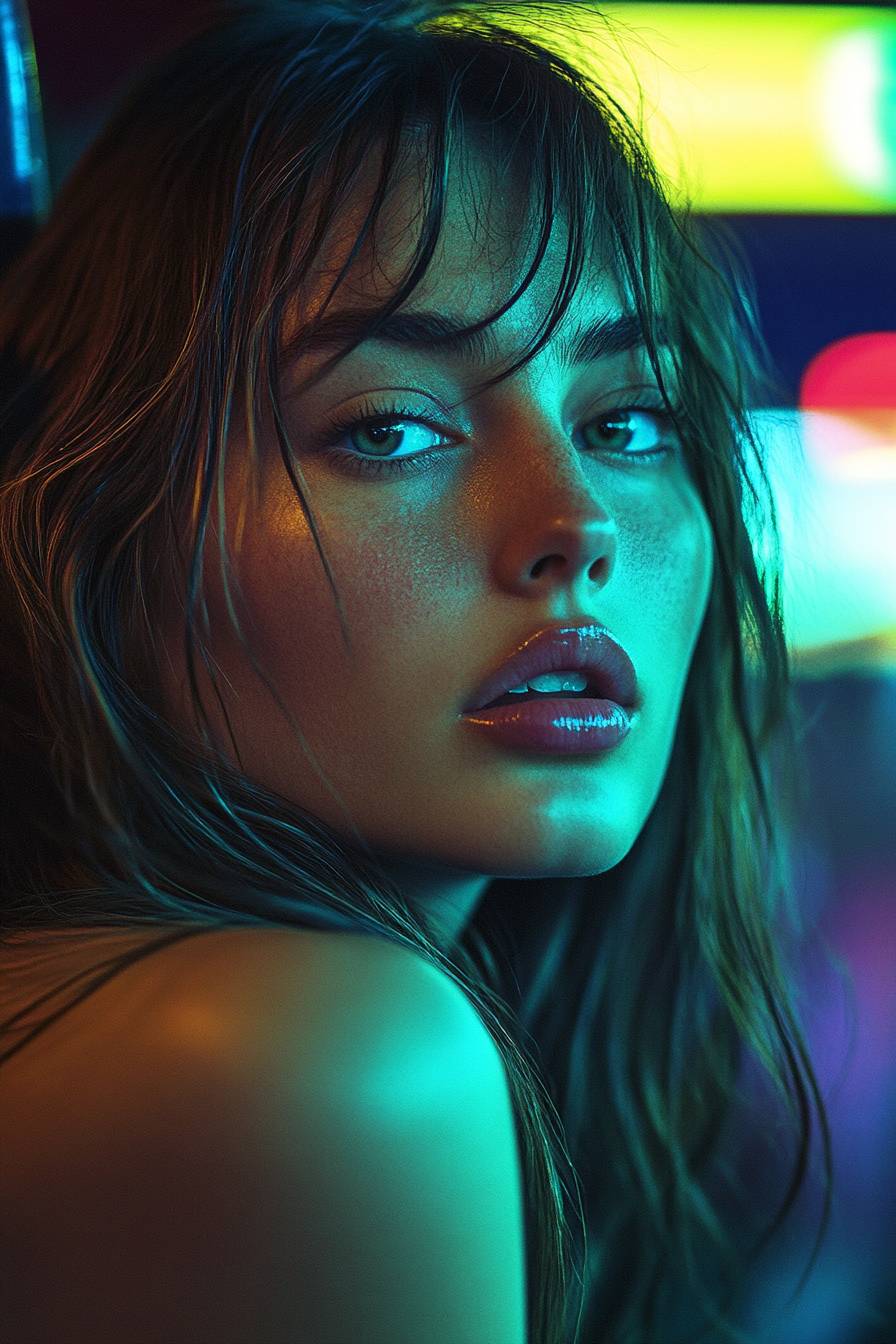 صورة لامرأة جميلة بأسلوب إكتاكروم، بأسلوب بورتريه تعبيرية حالمة. الإعداد هو نادٍ ليلي، مع أضواء نيون وتباين عالي. إنها لقطة بورتريه قريبة.