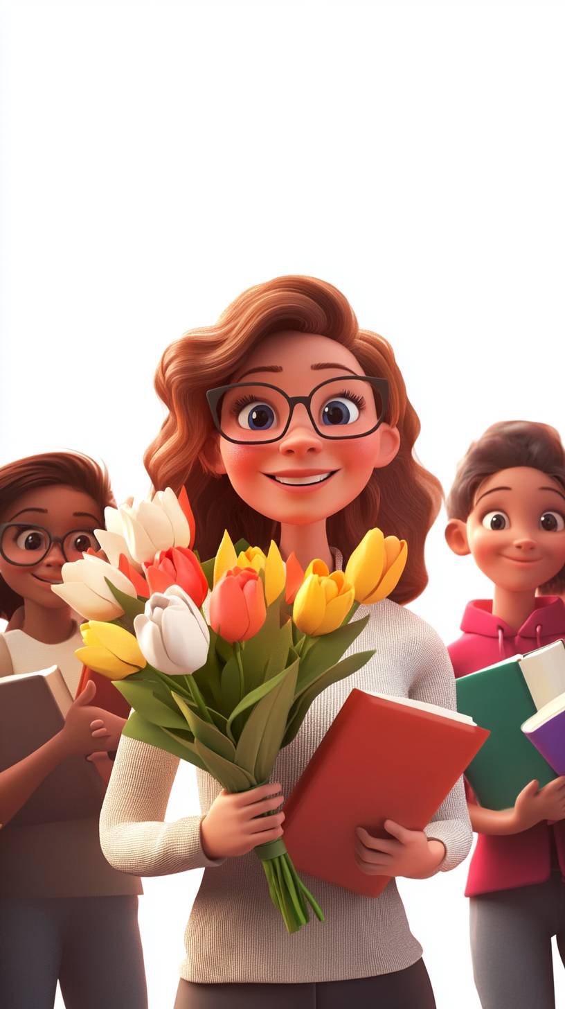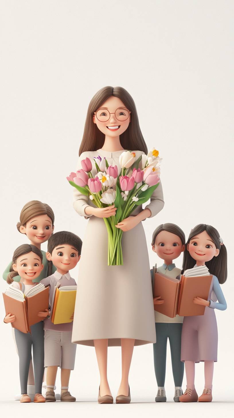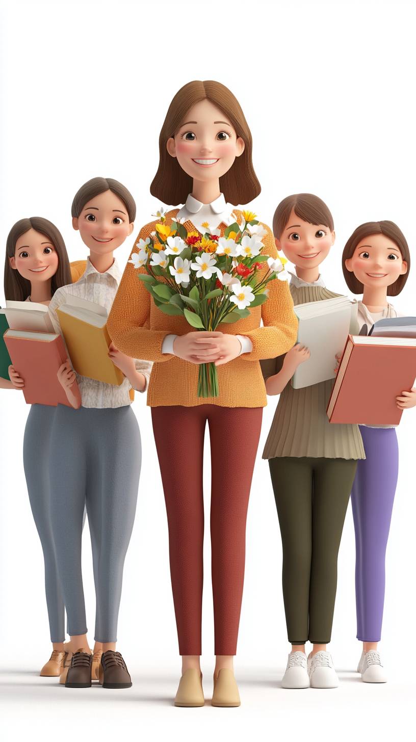 3D, teacher, warm atmosphere, teacher holding flowers and smiling, surrounded by students holding books and smiling, overall warm and happy atmosphere, white background --ar 9:16 --v 6.1