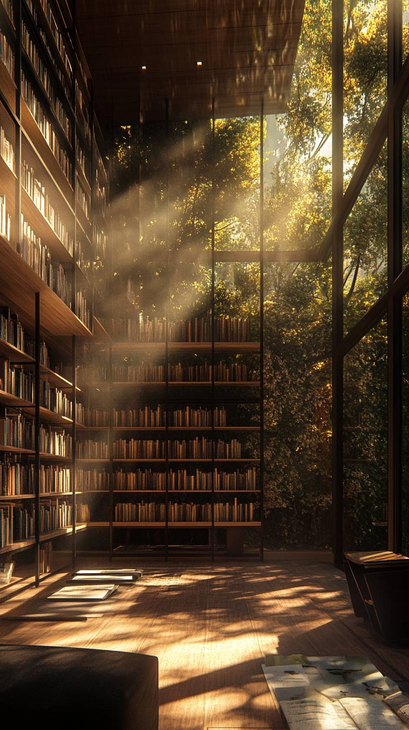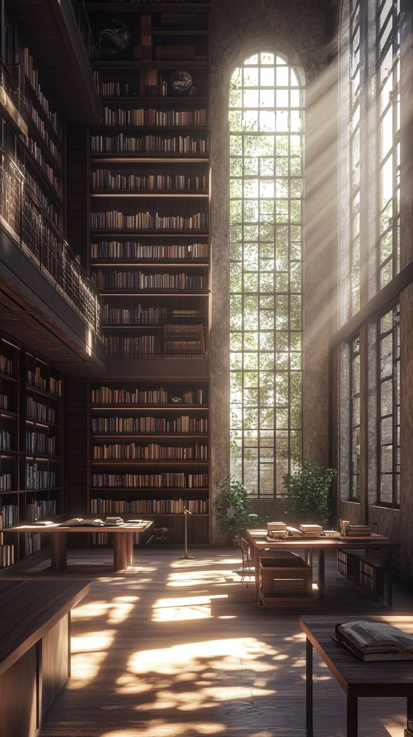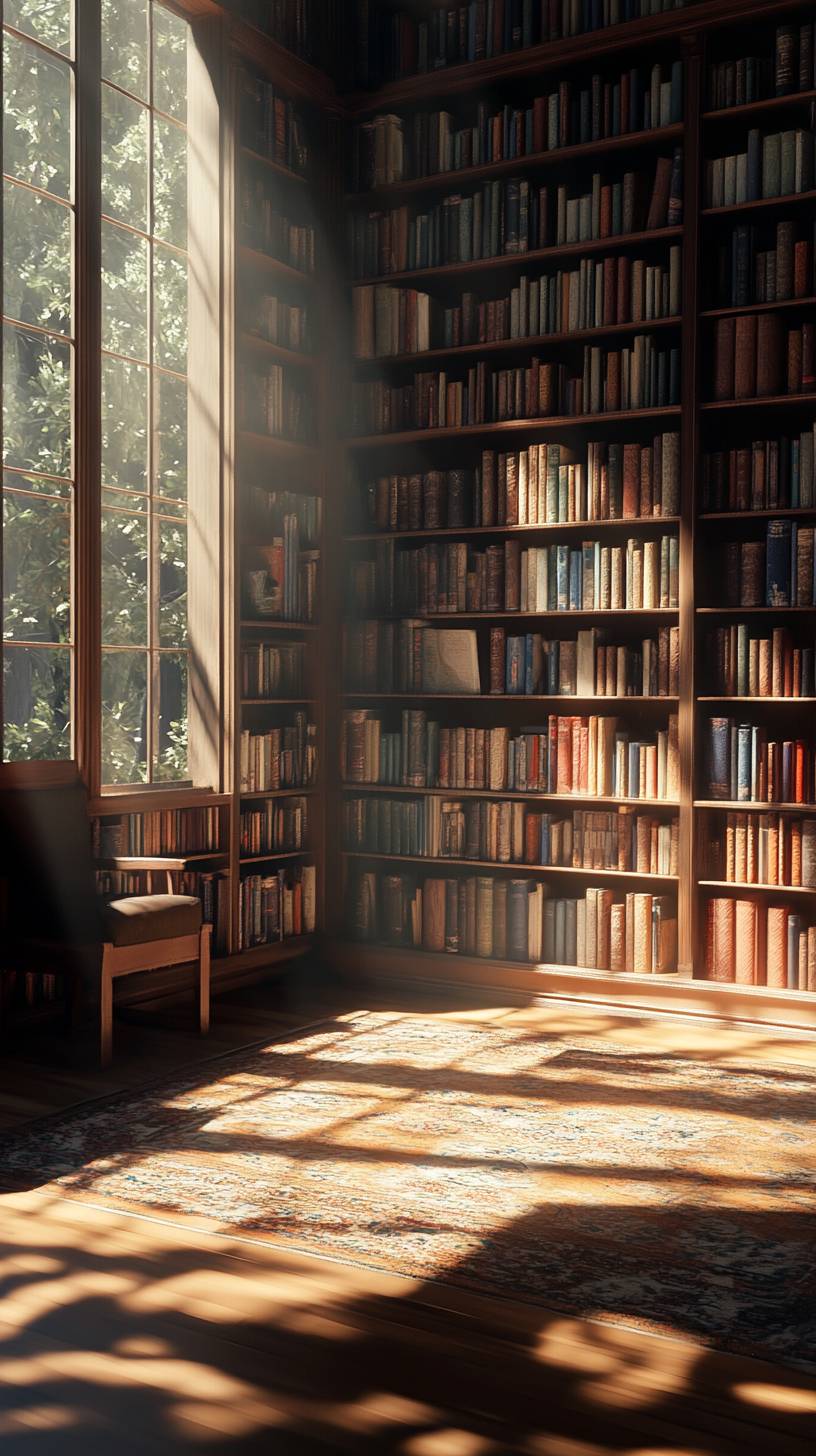 مكتبة واقعية مع ضوء شمس ناعم من اليمين.