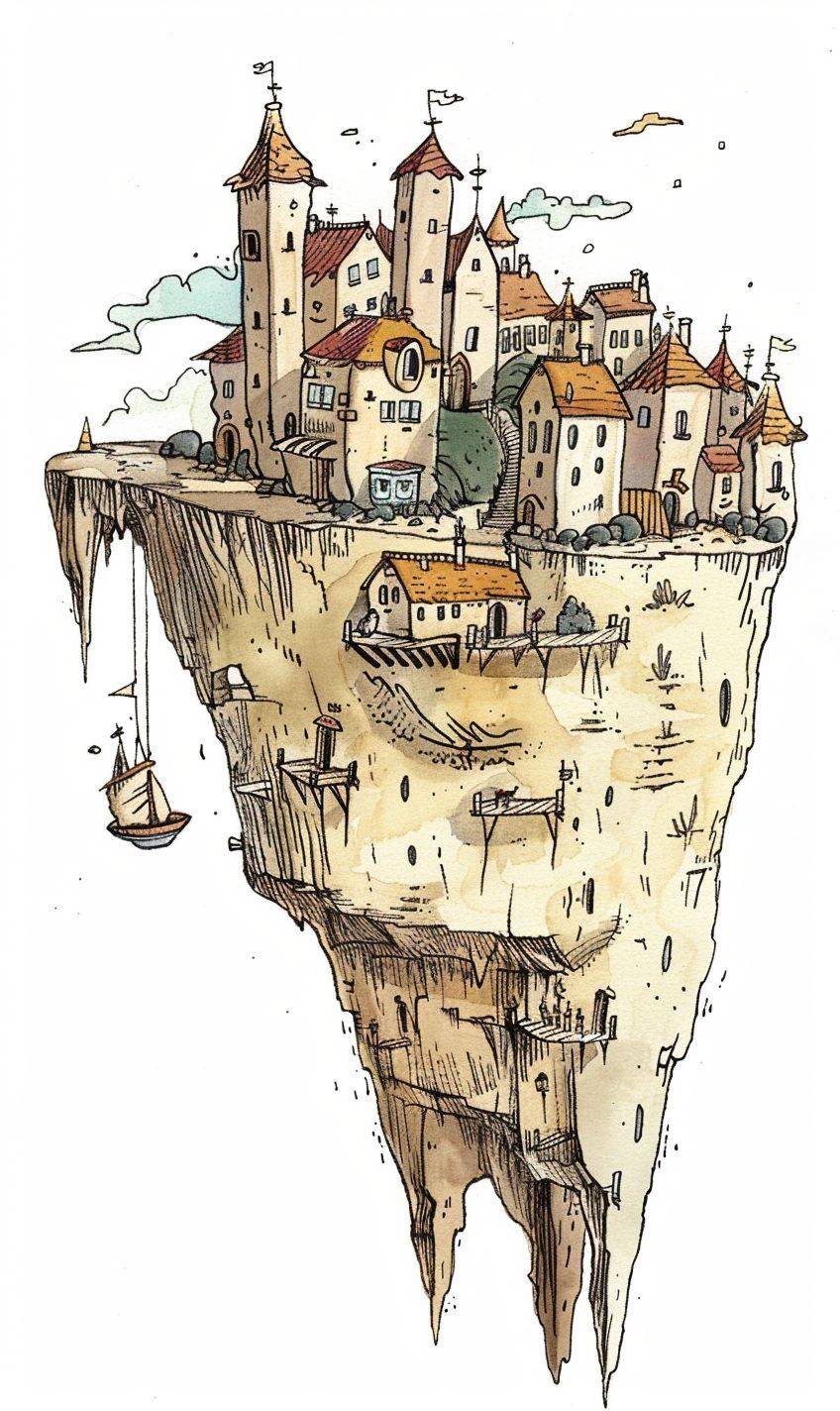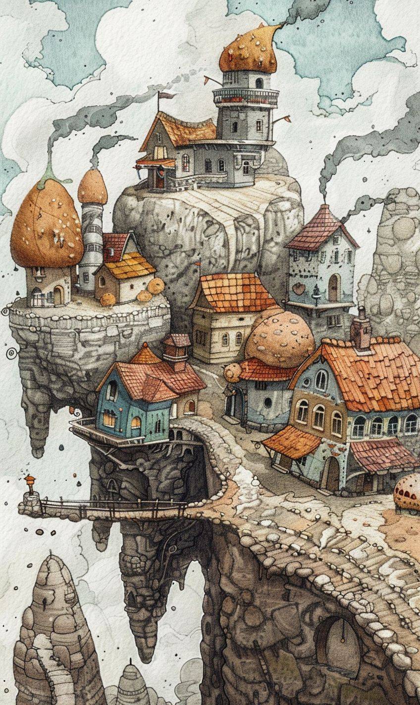 illustration in Liniers' style of a small world called Crumbland, where everything is made of bread crumbs. we see fantastical landscapes with houses made of crispy crusts and adorable creatures made of bread crumbs --ar 3:5