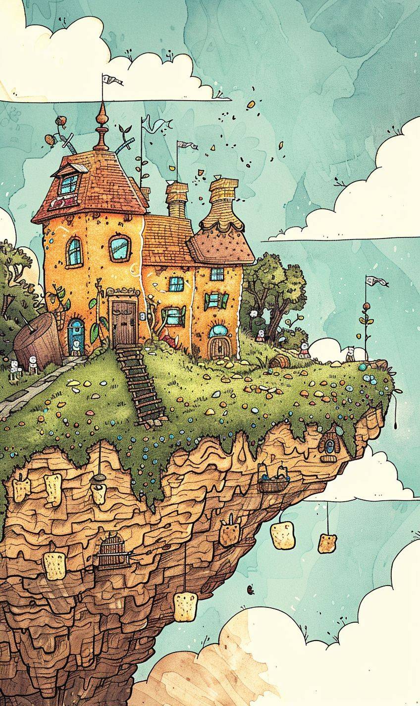 رسم توضيحي بأسلوب لينييرز لدوامة صغيرة تسمى كرامبلاند، حيث يتكون كل شيء من فتات الخبز. نرى مناظر طبيعية خيالية مع منازل مصنوعة من القشور المقرمشة ومخلوقات لطيفة مصنوعة من فتات الخبز.