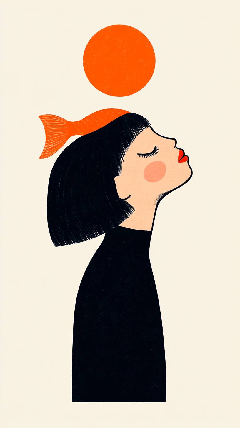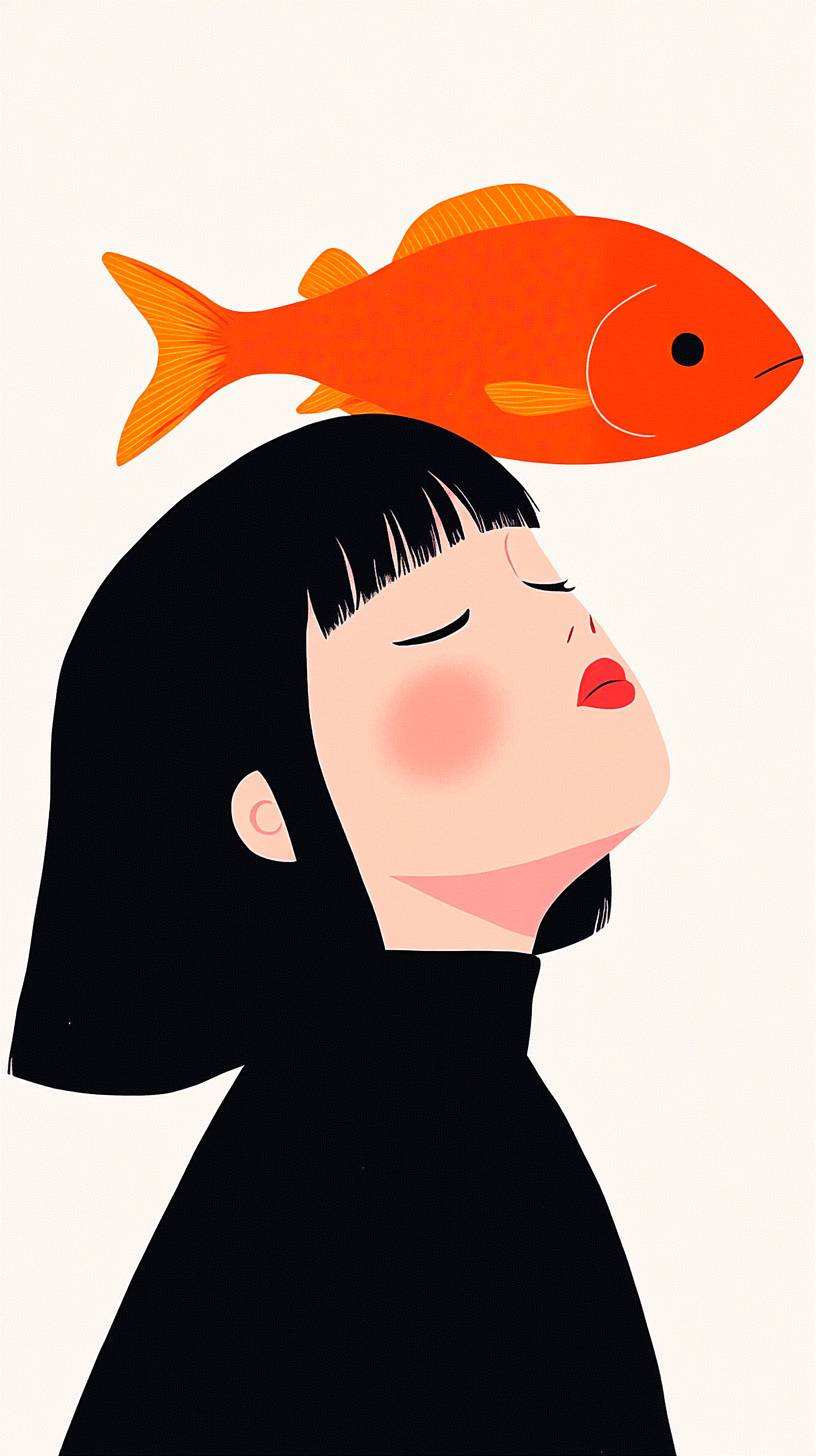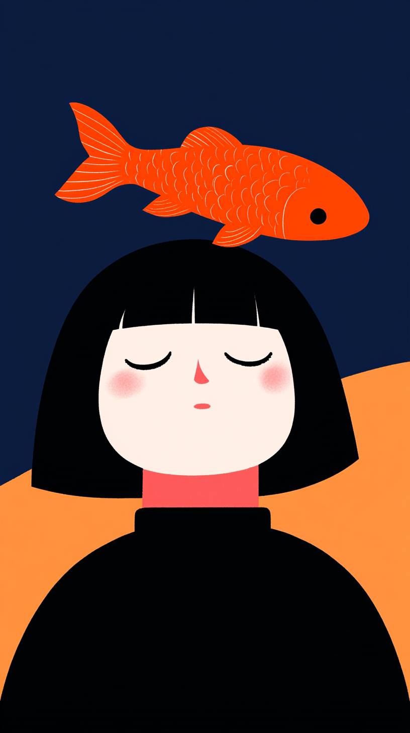 فتاة ذات عيون مغلقة وشعر قصير، ورأسها يطفو في الهواء كما لو كانت تتأمل فوق سمكة برتقالية. أسلوب الرسم مسطح وبسيط وعصري، مع ألوان زاهية وإضاءة نيون، على طراز جيمس توريلي.