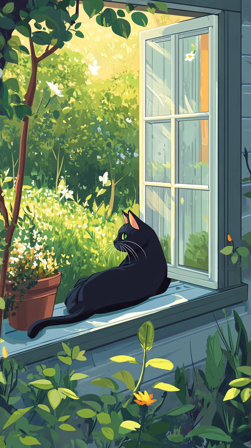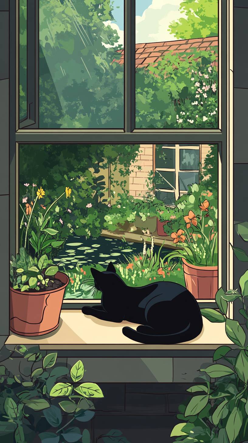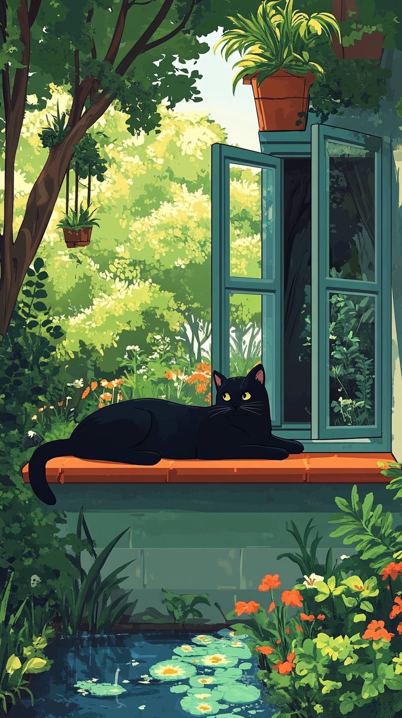 Camera is located outside 10m away from a black cat lying down on a window sill outside a cottage, looking over a garden containing plants, trees, a pond. summer setting, cartoon style --ar 9:16 --v 6.1