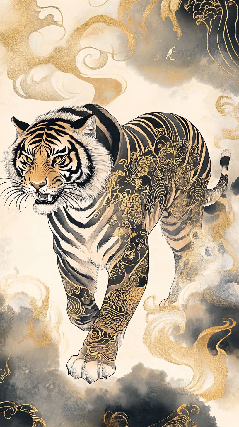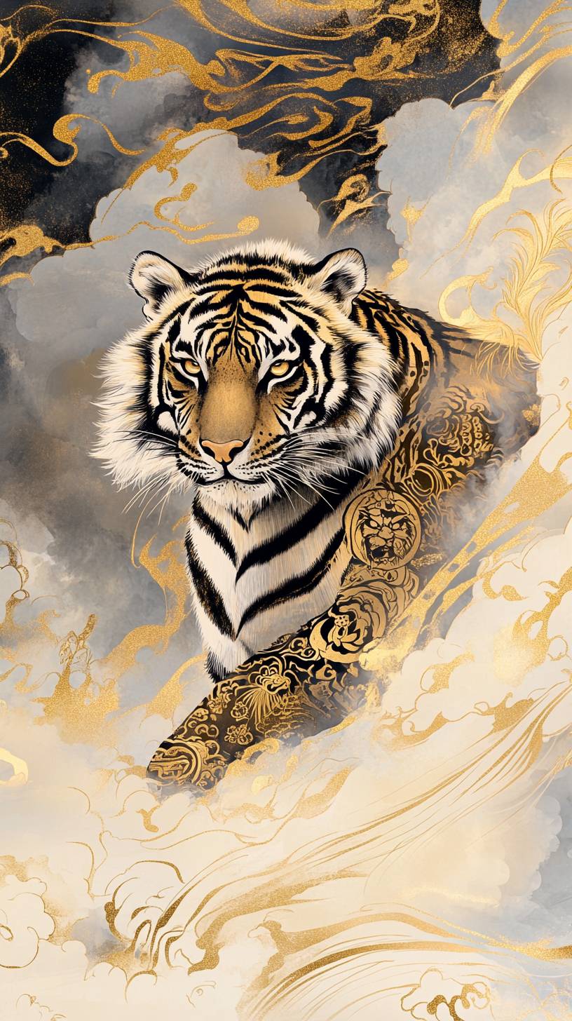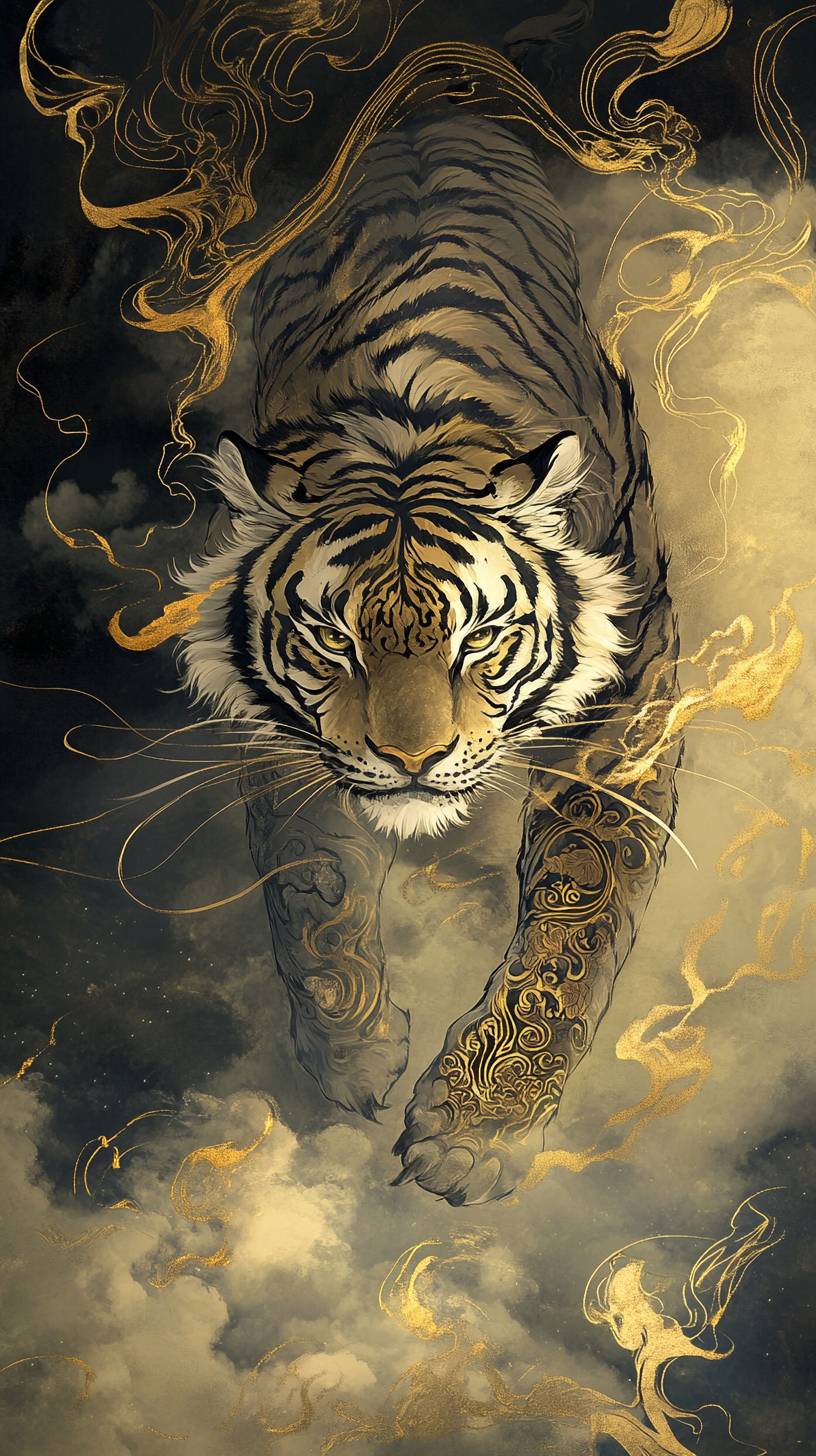 كان هناك نمر عظيم وصارم يقف، ينظر إلى الأمام مع نمط قديم على جسده، محاط بسحب مباركة وخلفية ضبابية، بأسلوب الرسم التقليدي بالحبر مع خطوط ذهبية. إنه مليء بالغموض والسحر، بأسلوب يو مي مع بورتريهات جوية مفصلة، بأسلوب ريوهي هاسي بألوان كريمة داكنة وذهبية في لقطات قريبة مكثفة مع درجات لون أصفر فاتح.