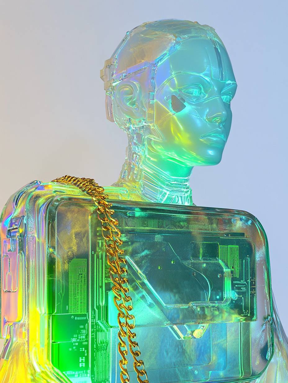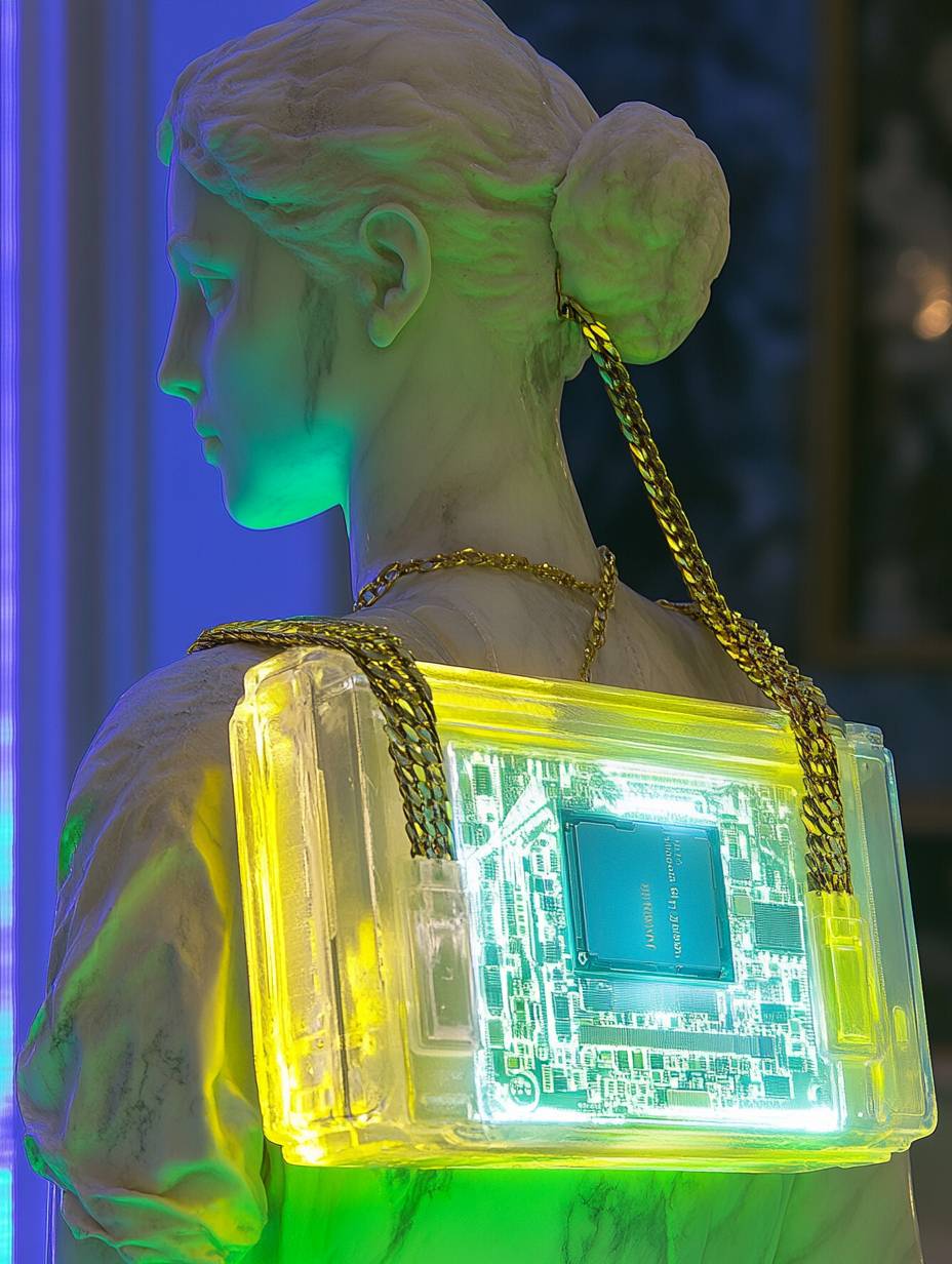 a portrait of a marble sculpture of a cyborg woman wearing a shoulder bag made of a piece of electronic (a graphic card) transparent case and gold chain, all in green, yellow and blue neon colours --ar 3:4 --v 6.1