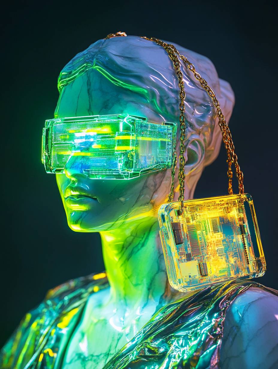 بورتريه لتمثال من الرخام لامرأة سايبورغ ترتدي حقيبة كتف مصنوعة من قطعة من غلاف إلكتروني شفاف (بطاقة رسومية) وسلسلة ذهبية، جميعها بألوان نيون أخضر وأصفر وأزرق.