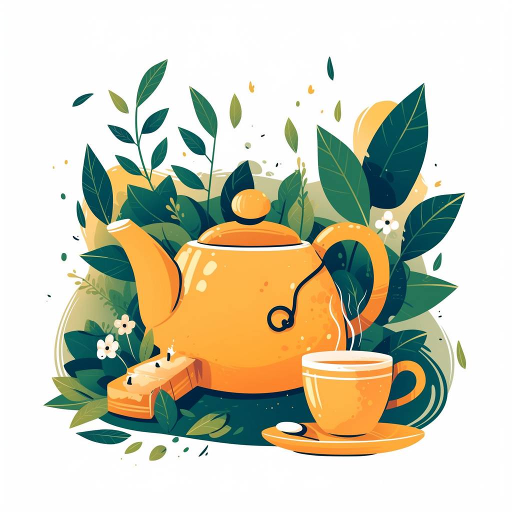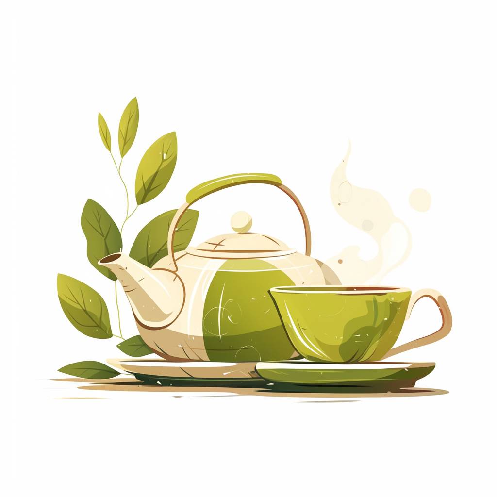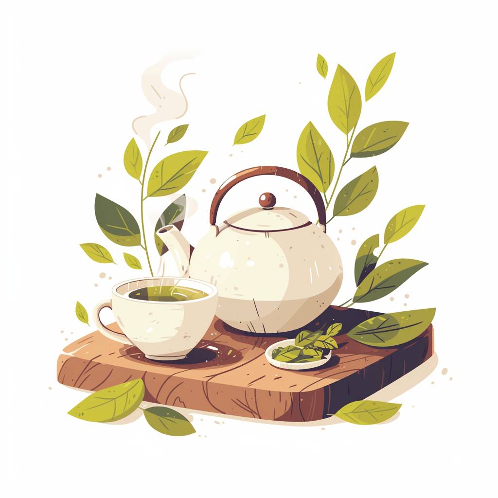 رسم توضيحي لكوب وشاي مع أوراق خضراء على خلفية بيضاء