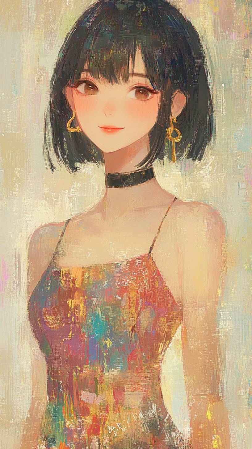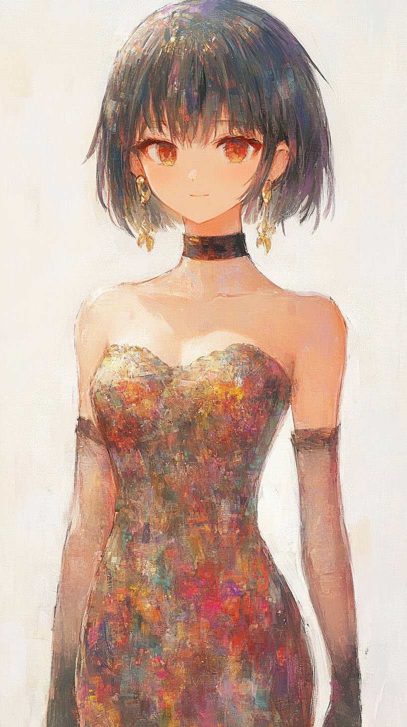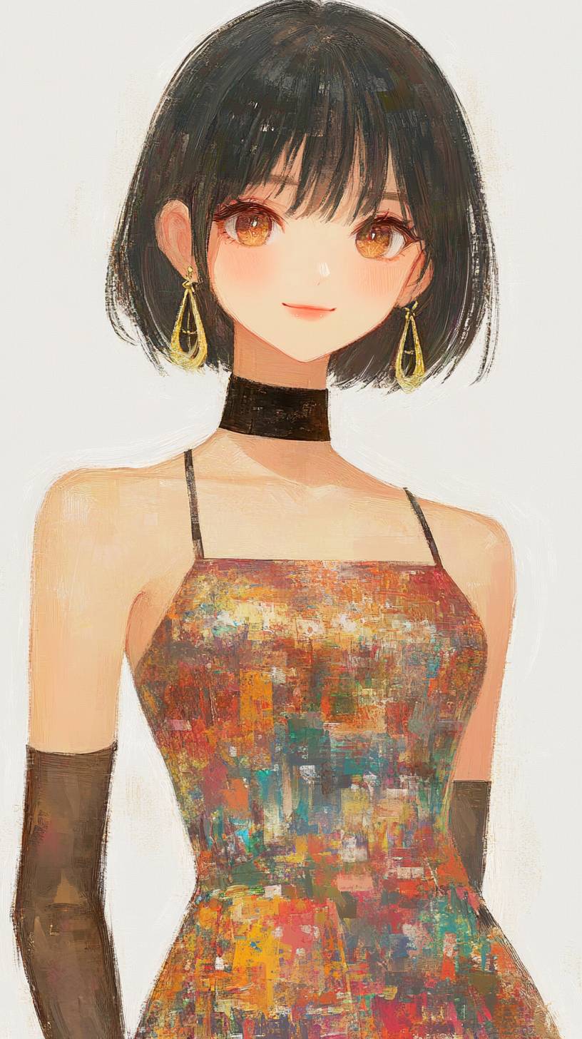 فتاة أنمي مصقولة بقصة شعر بوب قصيرة، وشعر أسود ناعم، وغرة ناعمة تحيط بوجهها. لها عيون كبيرة تعبر عن مشاعرها مع احمرار طفيف على خديها، ترتدي فستاناً أنيقاً ضيقاً بقصة جسمية بنمط مجرد بألوان أرضية. الفستان ذو أحزمة رفيعة، يكشف عن كتفيها الرشيقتين. تزينت بأقراط ذهبية طويلة، وقلادة سوداء بشريطة صغيرة، وقفازات دانتيل شبه شفافة. ساقاها متقاطعتان، ترتدي جوارب لامعة شبه شفافة وكعب عالٍ أسود مع أربطة للكاحل. الخلفية بسيطة، مما يبرز وجودها الأنيق والعصري.