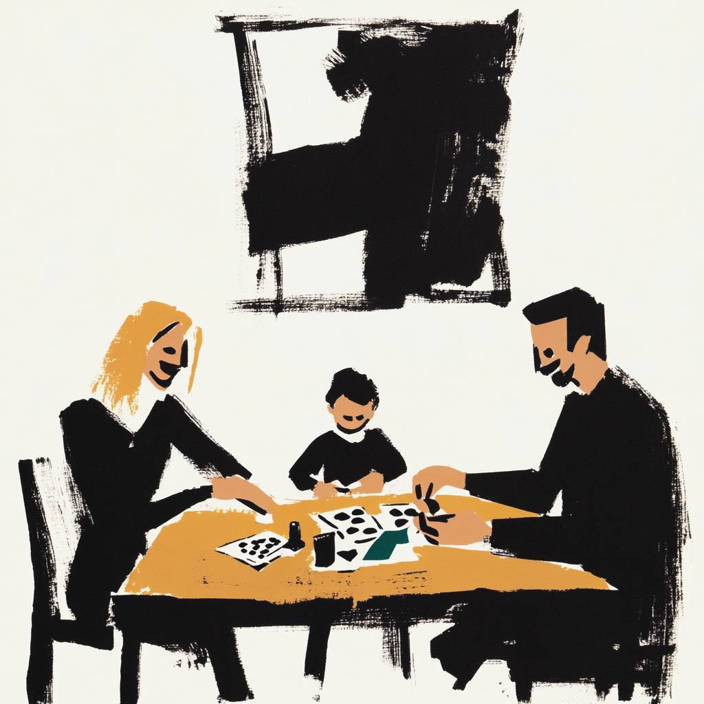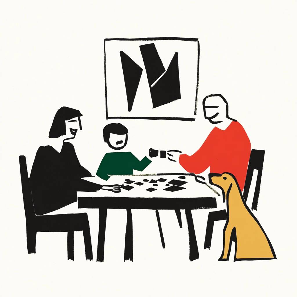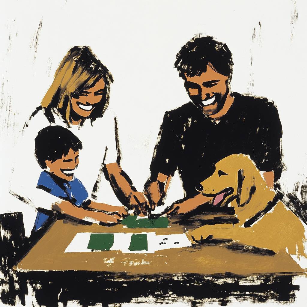 A family consisting of a mother, a father, and an 8-year-old boy sit at a dining table playing a card game. The family is happy and laughing. A golden retriever sits next to the table. --ar 1:1 --sref 3815222944 --v 6.1