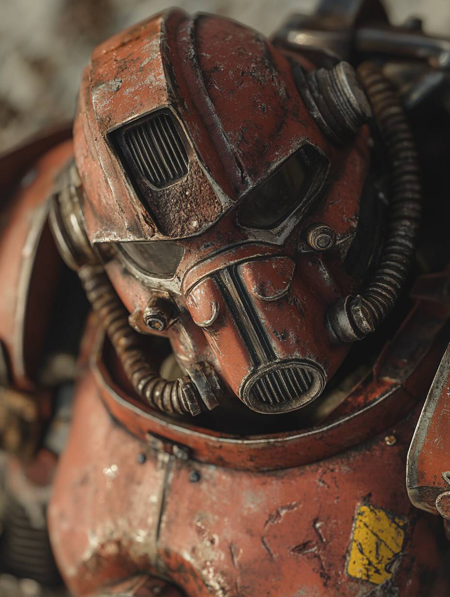 closeup [SUBJECT] wearing Power Armor set of mechanized armor providing superior protection and strength, iconic in the Fallout video game series, Mechanized suit, Fallout, post-apocalyptic, heavy --ar 3:4
