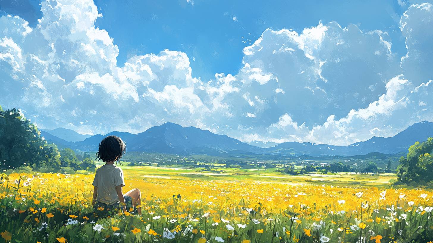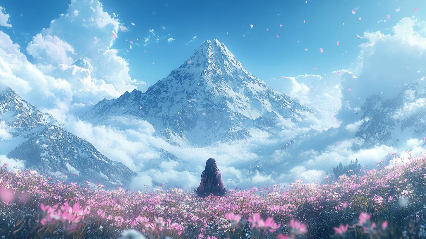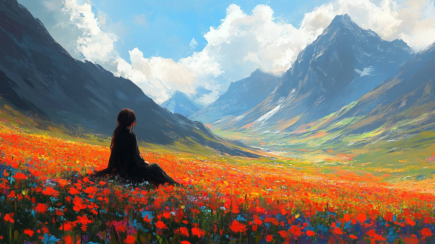 large mountains, blue skies with a huge field of flowers with a cute lofi girl sitting down in the distance looking off --chaos 20 --ar 16:9 --stylize 200 --v 6.1