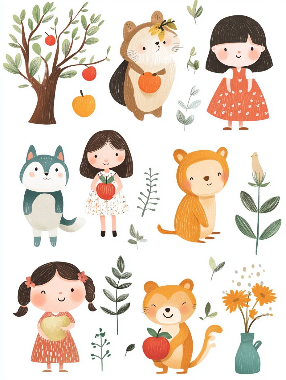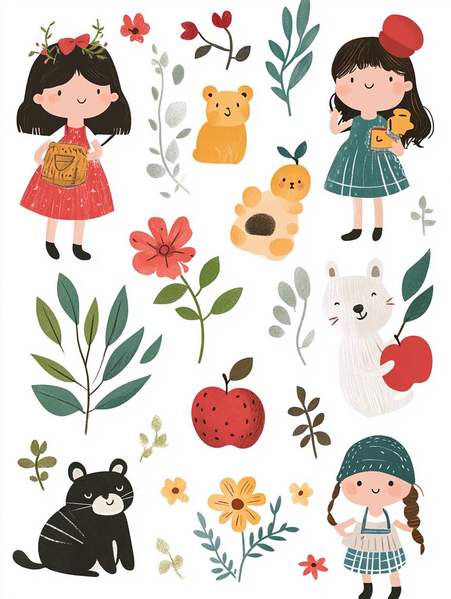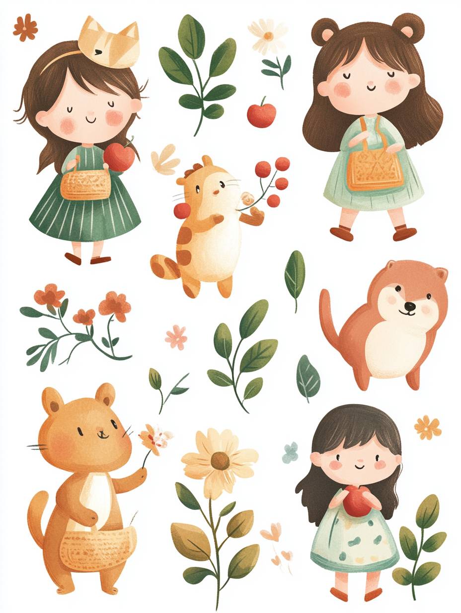 Cute stickers, various animal and character illustrations, green leaves, flowers in vases, girls wearing dresses with hair accessories on their heads holding bags or school bags; a cat is playing hide-and-seek among the trees, a bear wears an apple-shaped hat while eating apples, anthropomorphic animals wear like humans; simple strokes, white background, colorful cartoon style. --ar 40:53 --v 6.1