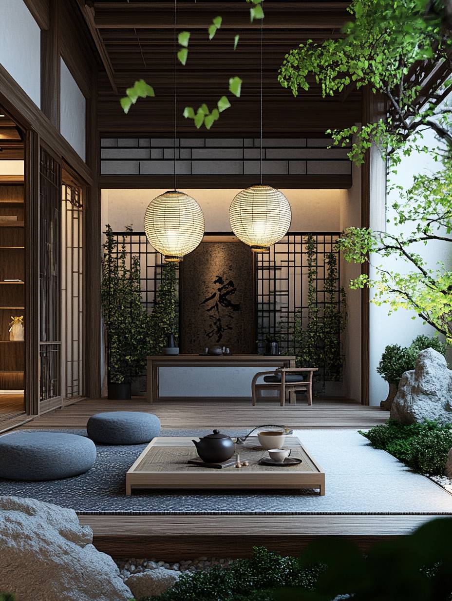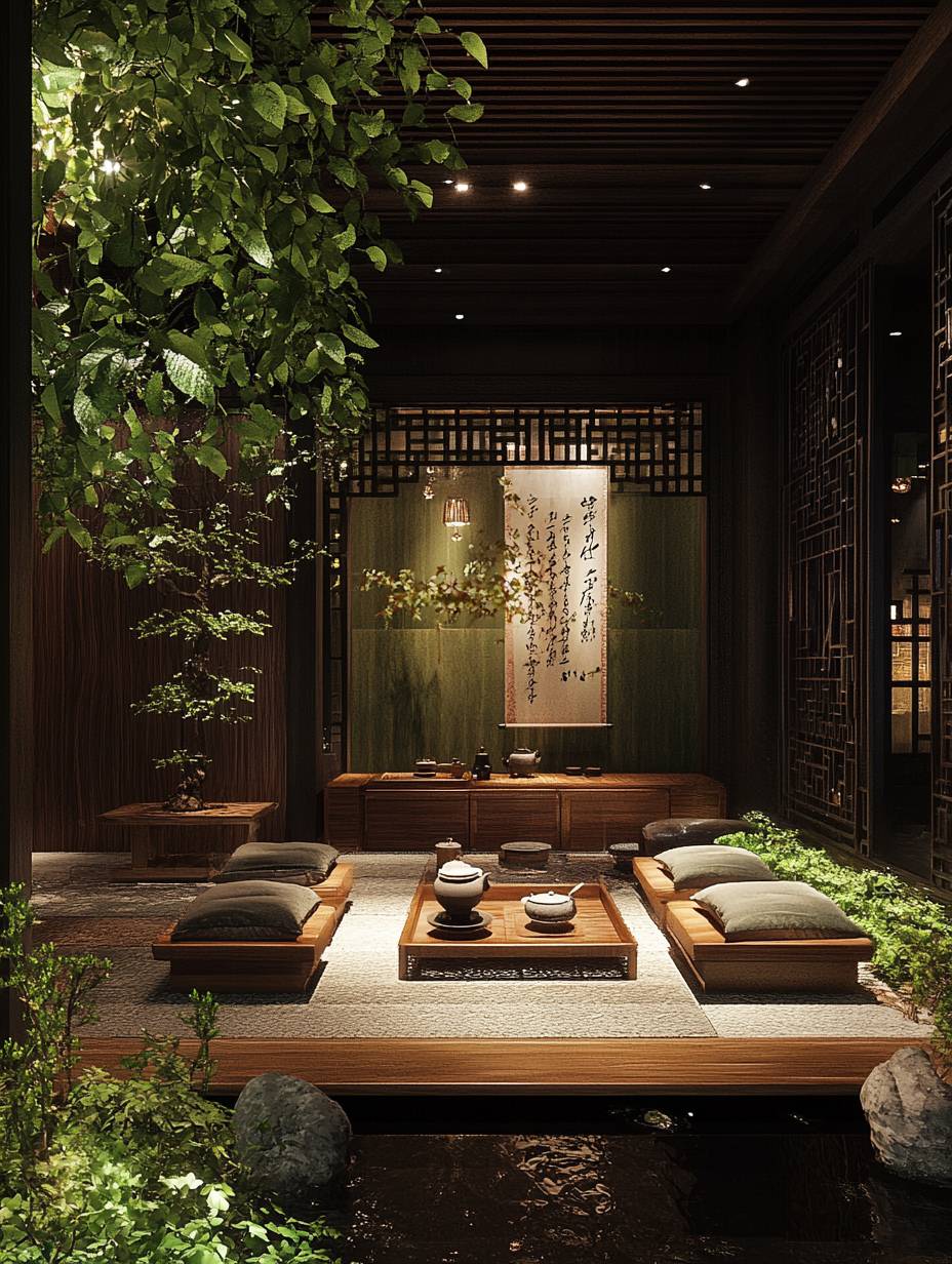 night Flowers and greenery Traditional: Emphasizing the use of authentic and time-honored design elements. Chinese: Incorporating elements of Chinese culture and aesthetics. Tea: Focusing on the central theme of tea and its rituals. Zen: Creating a serene and peaceful atmosphere. Minimalism: Simplifying the design and avoiding excessive ornamentation. Nature: Integrating natural elements such as plants, stones, and water features. Harmony: Striving for a balanced and harmonious arrangement of space and objects. Tranquility: Cultivating a calm and tranquil ambiance. Organic: Using natural materials like wood, bamboo, and paper. Flow: Ensuring a smooth and continuous flow of movement within the space. Soft Lighting: Employing warm and subdued lighting to create a soothing environment. Calligraphy: Incorporating Chinese calligraphy as decorative elements. Seating: Providing comfortable seating options like floor cushions or low benches. Meditation: Creating a space suitable for contemplation and mindfulness practices. Tea Utensils: Displaying traditional tea utensils like teapots, tea cups, and bamboo tea trays. --ar 3:4 --v 6.1