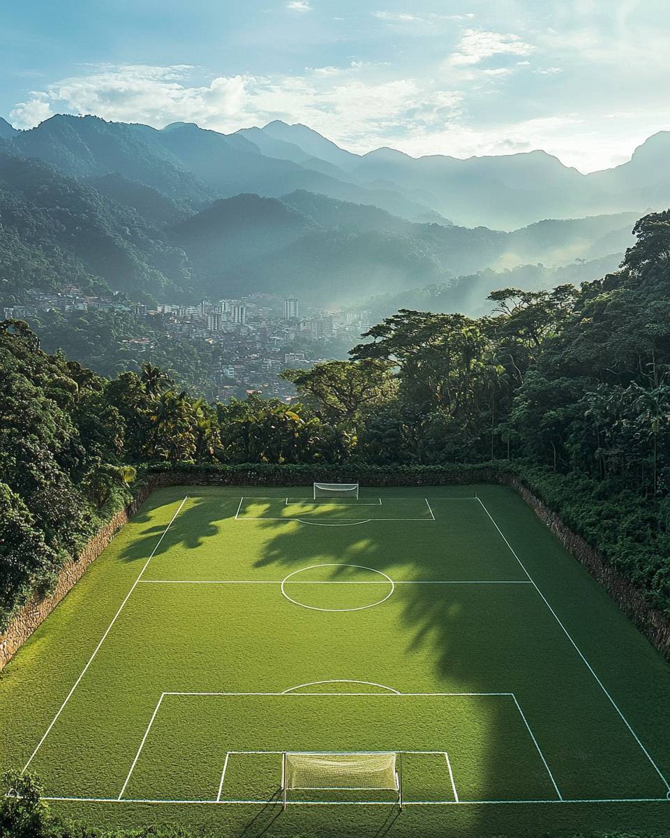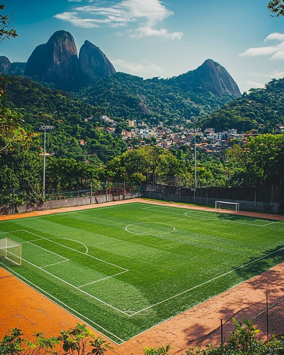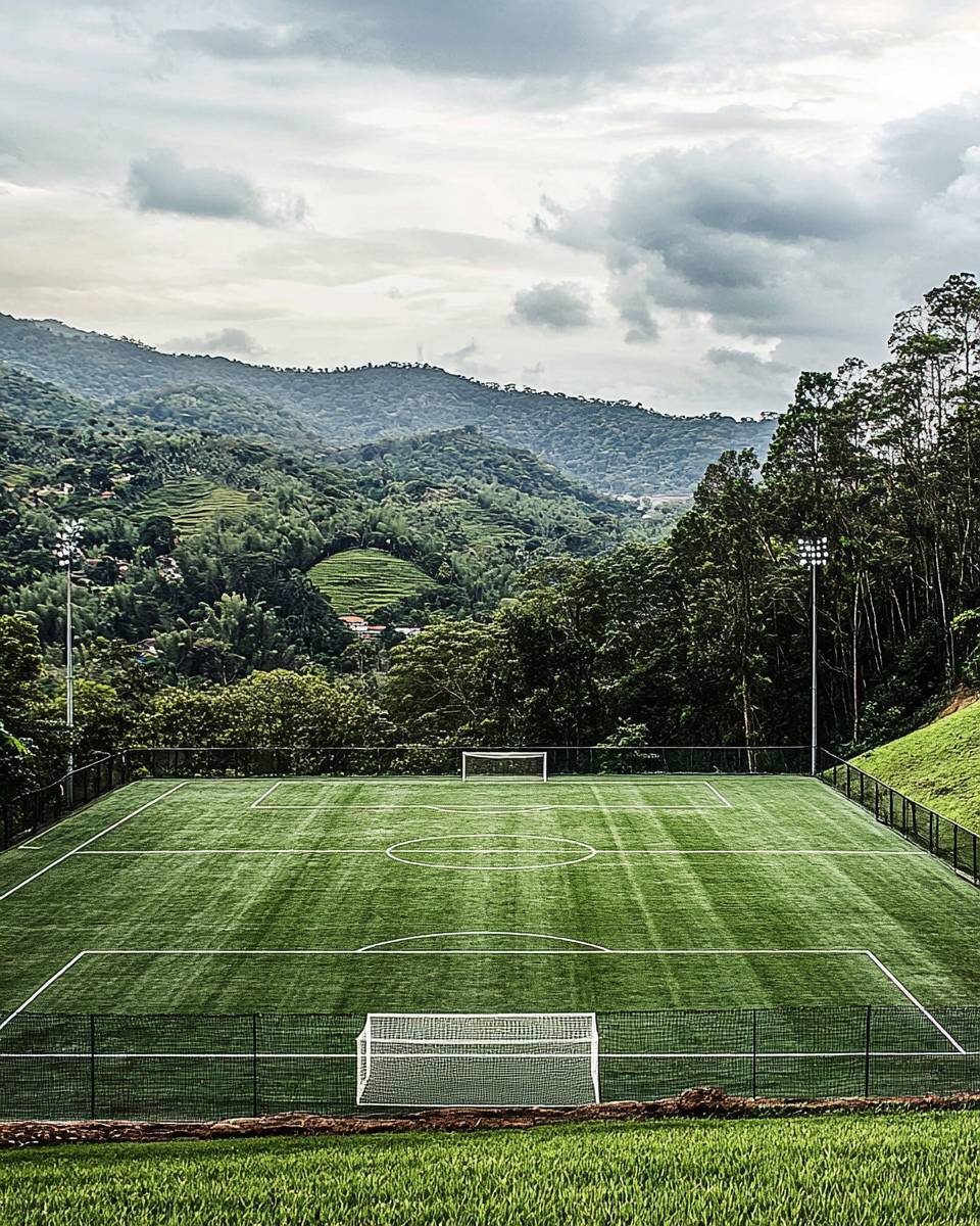 Fußballfeld in Brasilien mit Werbefotografie und Hügeln des Atlantischen Waldes im Hintergrund.