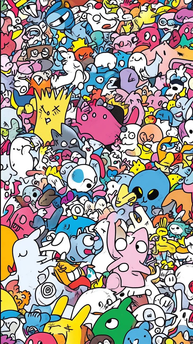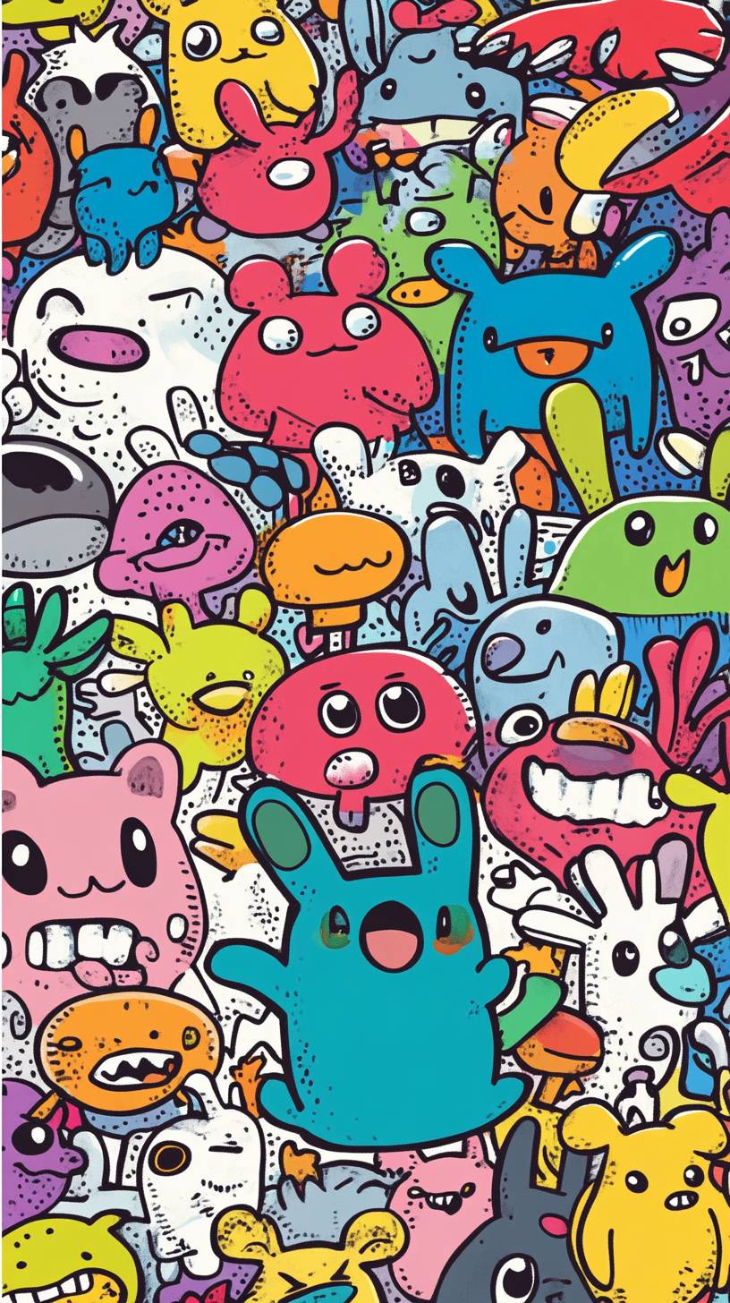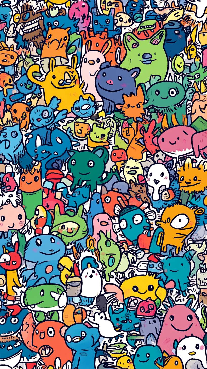 A full page of cute doodles cartoon color animal prints, doodles in the style of Keith Haring and Takashi Murakami, simple line drawings, playful character designs, all-white backgrounds, high resolution, high detail, sharp focus, intricate details, bright colors, high contrast --ar 9:16 --v 6.1