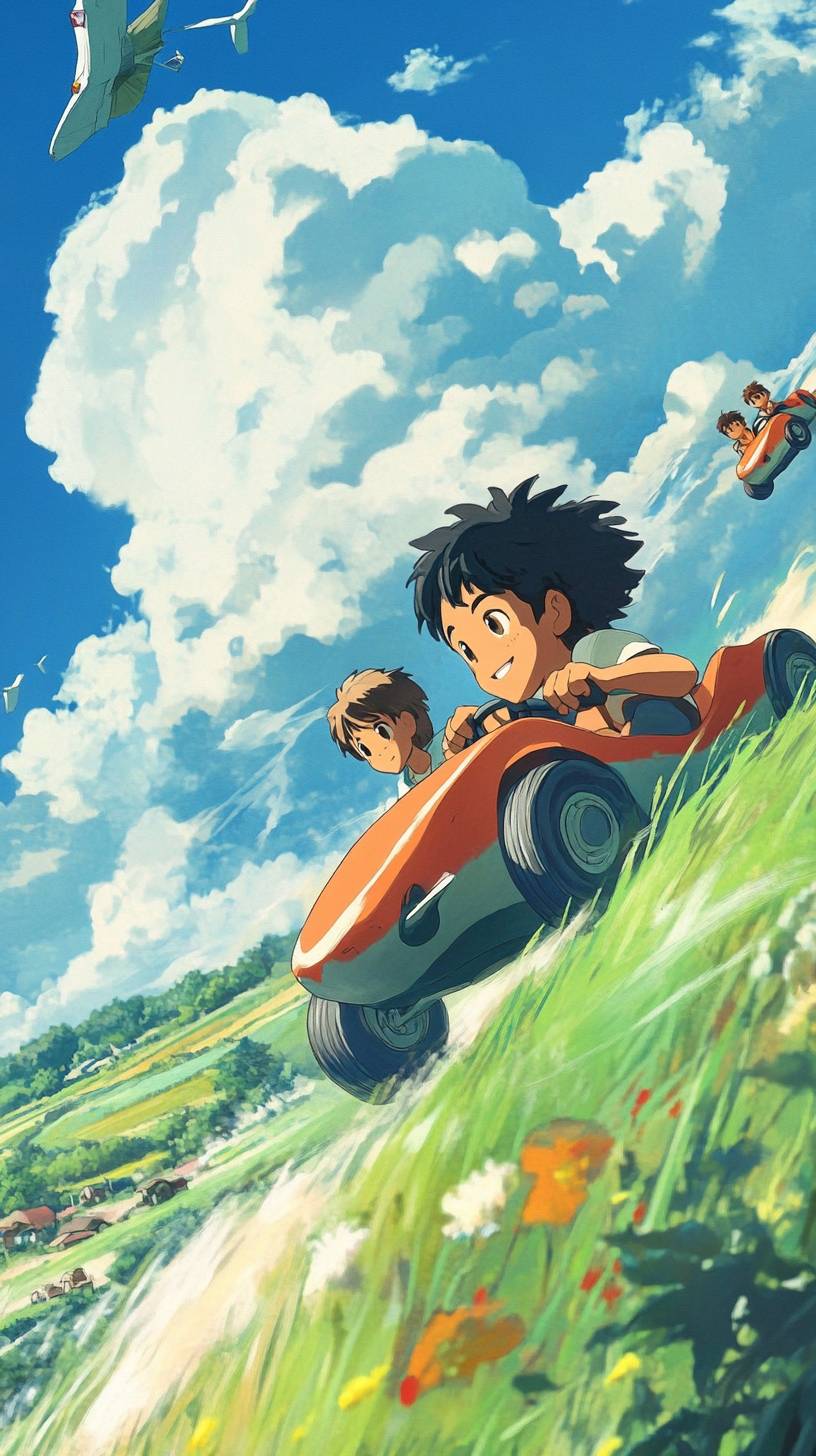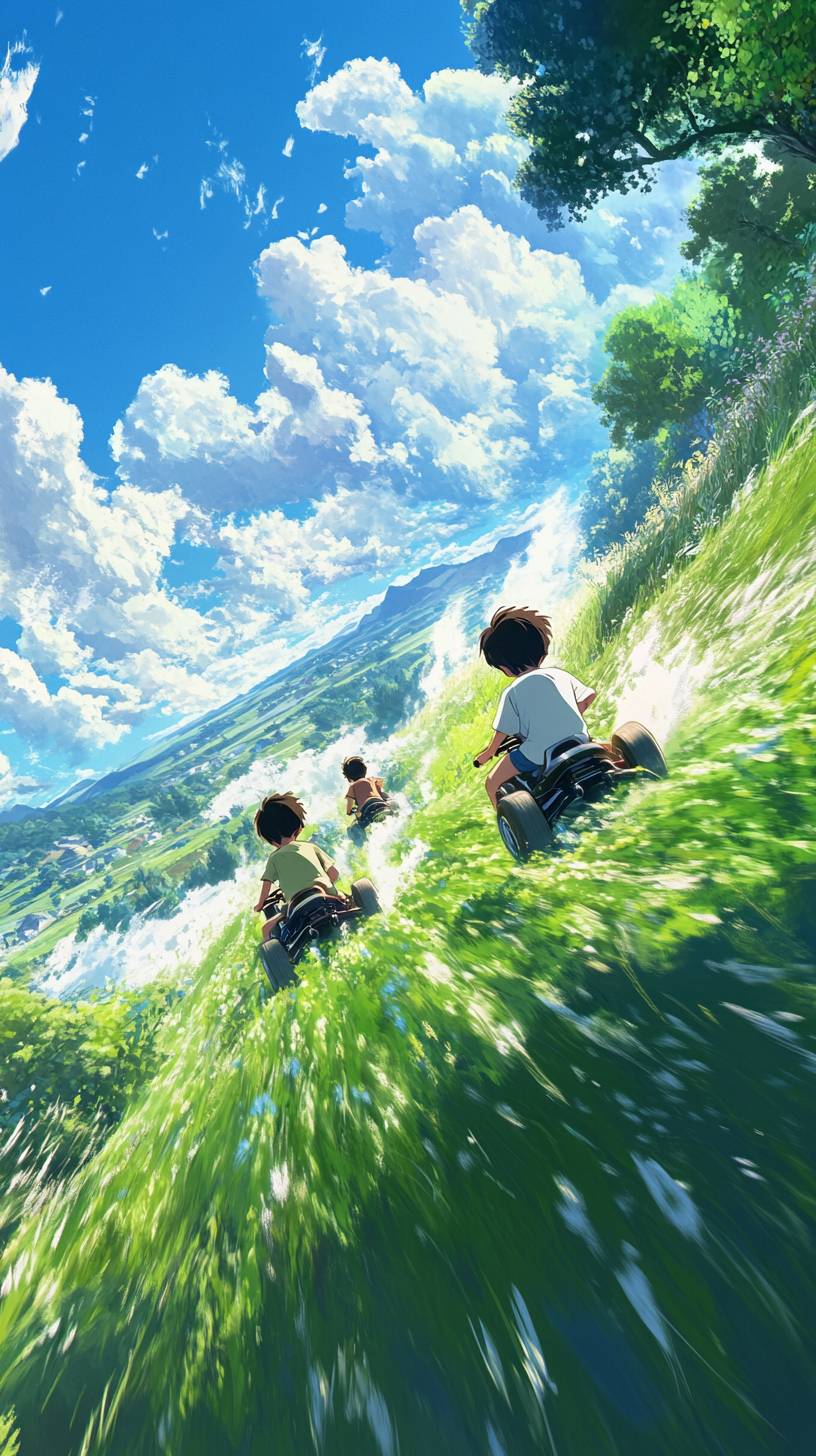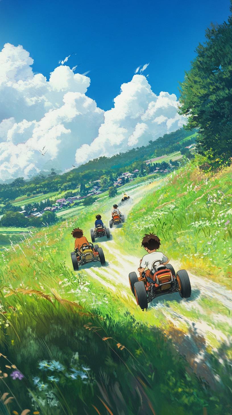 anime style poster of young boys riding incredibly fast karts through an endless green field zooming towards camera, movie poster, studio ghibli, --ar 9:16 --v 6.1
