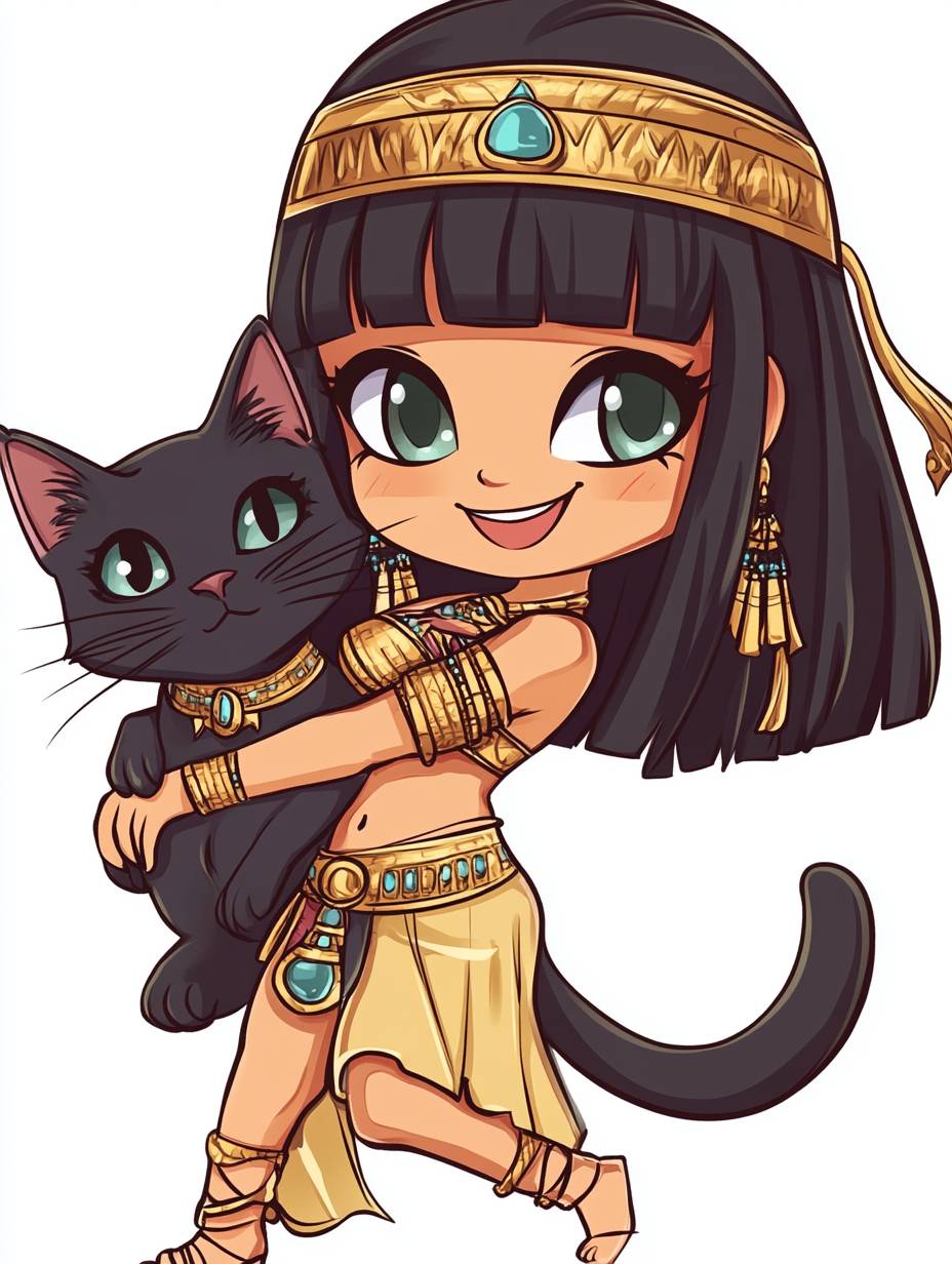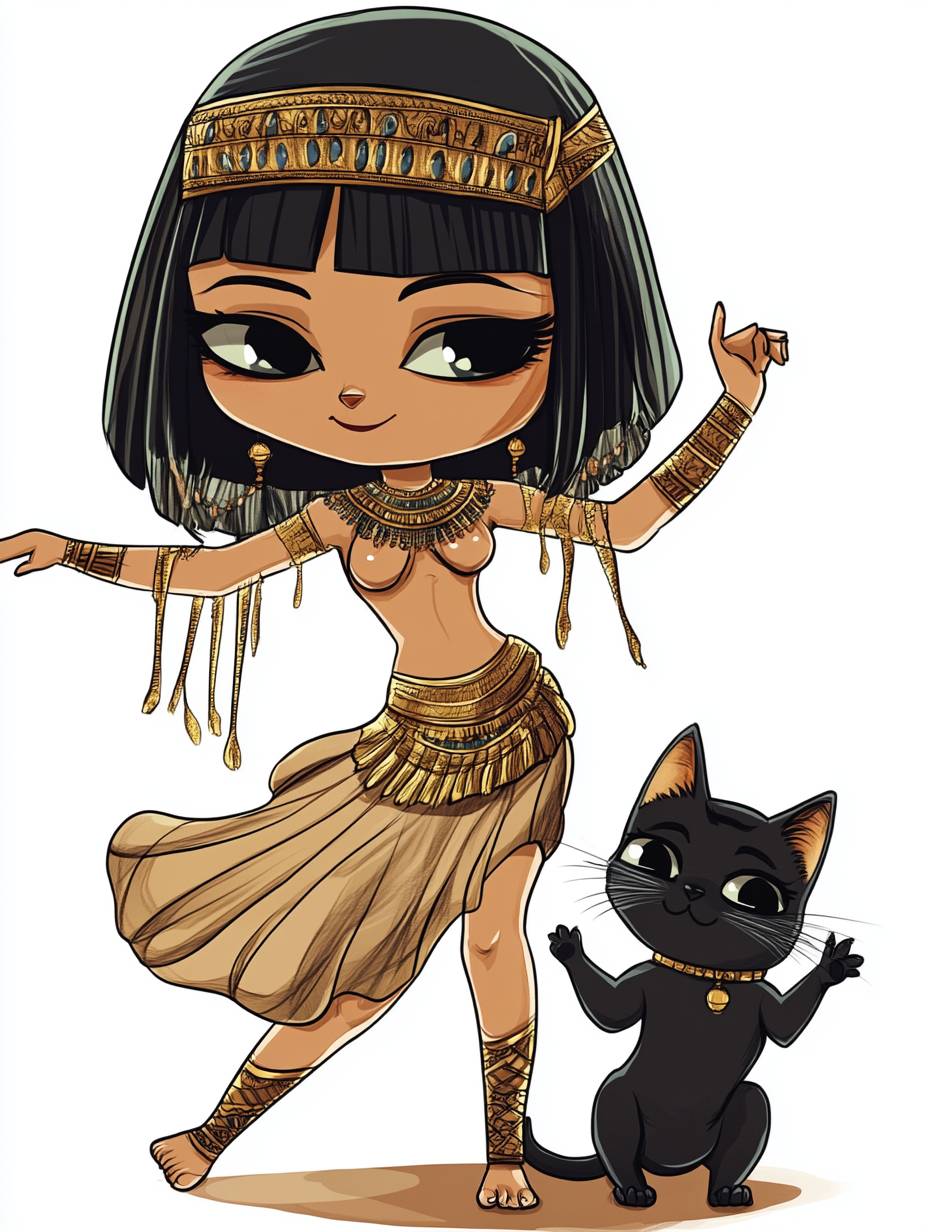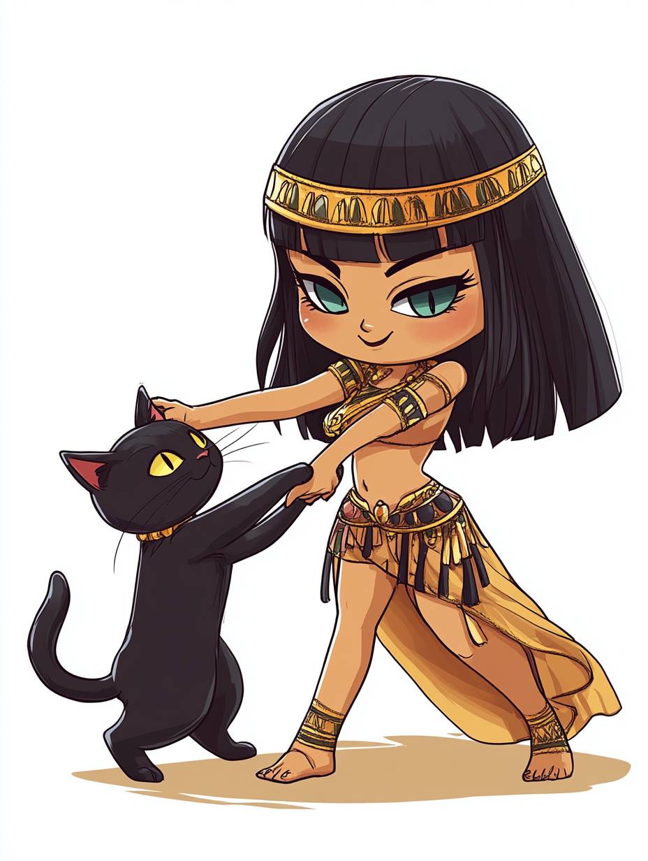 Kleopatra tanzt mit ihrer schwarzen Katze im niedlichen Chibi-Anime-Stil.