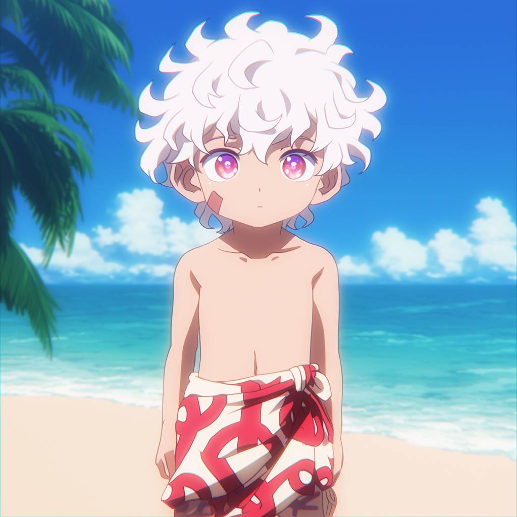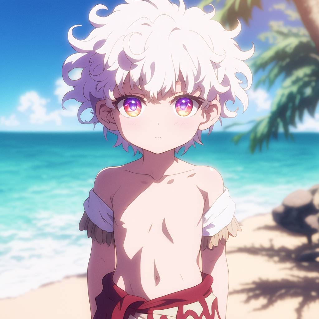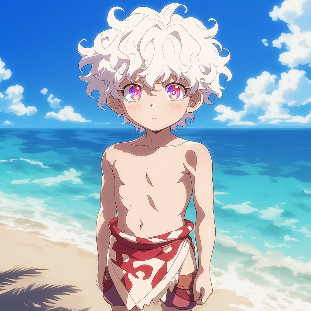 Ein Anime-Screenshot von einem süßen 7-jährigen Jungen mit lockigem, zotteligem weißen Haar und schillernden rot-violetten Augen, der einen kurzen alten, arkanen, rot-weißen byzantinischen skythischen keltischen tropischen Inselstamm-Windel trägt. Er steht an einem tropischen Strand, ist leicht androgyn, sehr schlank mit sanften Gesichtszügen. Er hat dünne Gliedmaßen, einen dünnen Oberkörper und Rahmen, ist sehr klein und unglaublich süß. Animiert im Stil von Made in Abyss, Pokémon, That Time I Got Reincarnated as a Slime, Mushoku Tensei, Studio Ghibli, Disney und Fate Stay Night.
