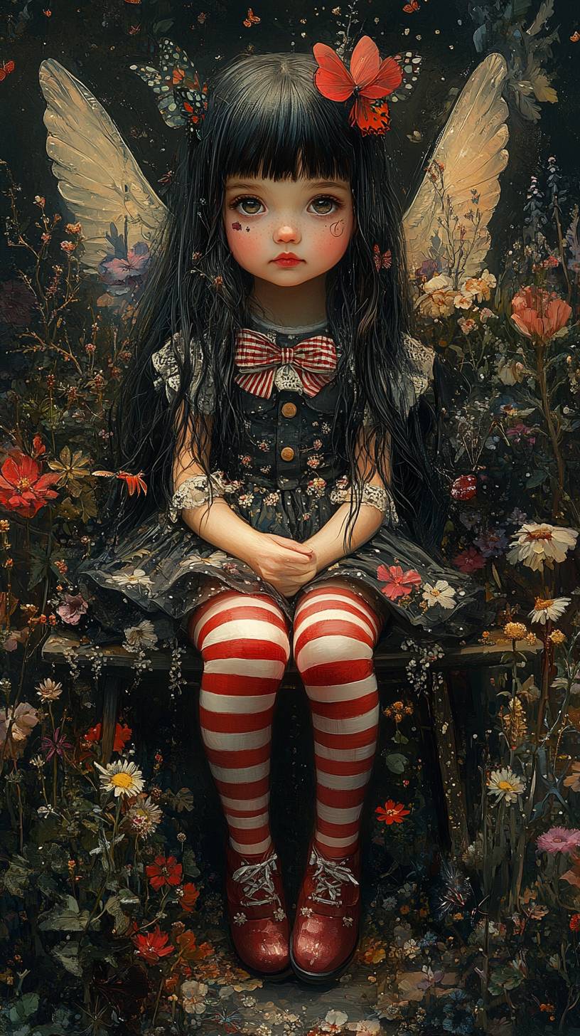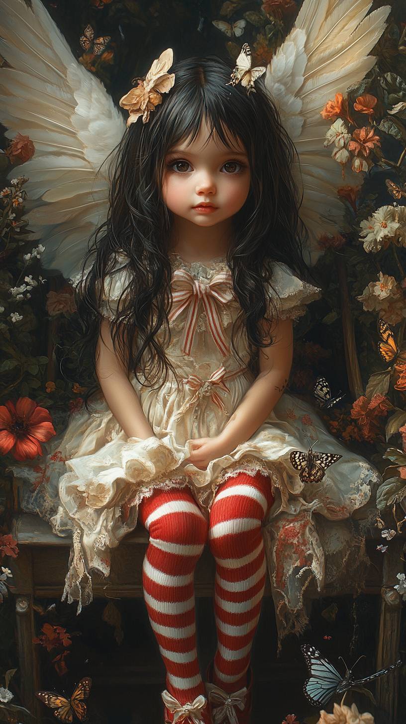 A little girl with long black hair, wearing red and white striped tights and shoes, sits on a bench in front of her garden full of flowers and butterflies. She is wearing an adorable dress with bows, has a cute doll-like face, big eyes, and a sweet smile. Angel wings are on her back, giving her a delicate and ethereal appearance. The scene is surreal with soft lighting and dreamy tones, blending fantasy and reality. The colors are soft and mysterious, with intricate details, ultra-high resolution, and set in a whimsical and enchanting garden. --ar 9:16 --style raw --stylize 750 --v 6.1