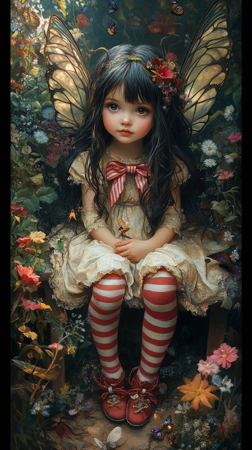 Ein kleines Mädchen mit langen schwarzen Haaren, das rote und weiße gestreifte Strumpfhosen und Schuhe trägt, sitzt auf einer Bank vor ihrem Garten voller Blumen und Schmetterlinge. Sie trägt ein entzückendes Kleid mit Schleifen, hat ein süßes Puppengesicht, große Augen und ein süßes Lächeln. Engelshaut stehen auf ihrem Rücken und verleihen ihr ein zartes und ätherisches Erscheinungsbild. Die Szene ist surreal mit sanfter Beleuchtung und traumhaften Tönen, die Fantasie und Realität vermischen. Die Farben sind sanft und geheimnisvoll, mit komplizierten Details, ultra-hoher Auflösung, und in einem fantasievollen und bezaubernden Garten.