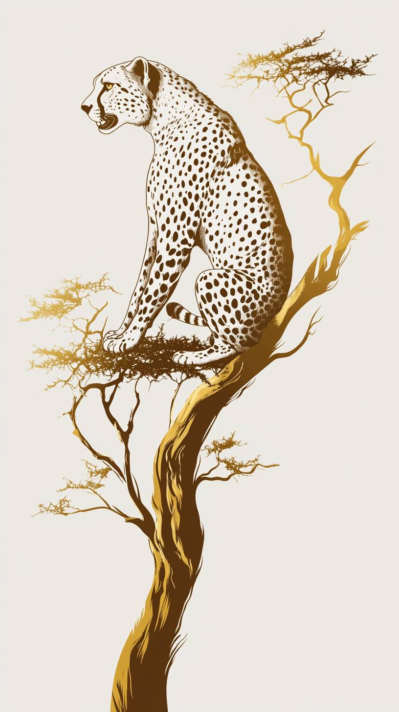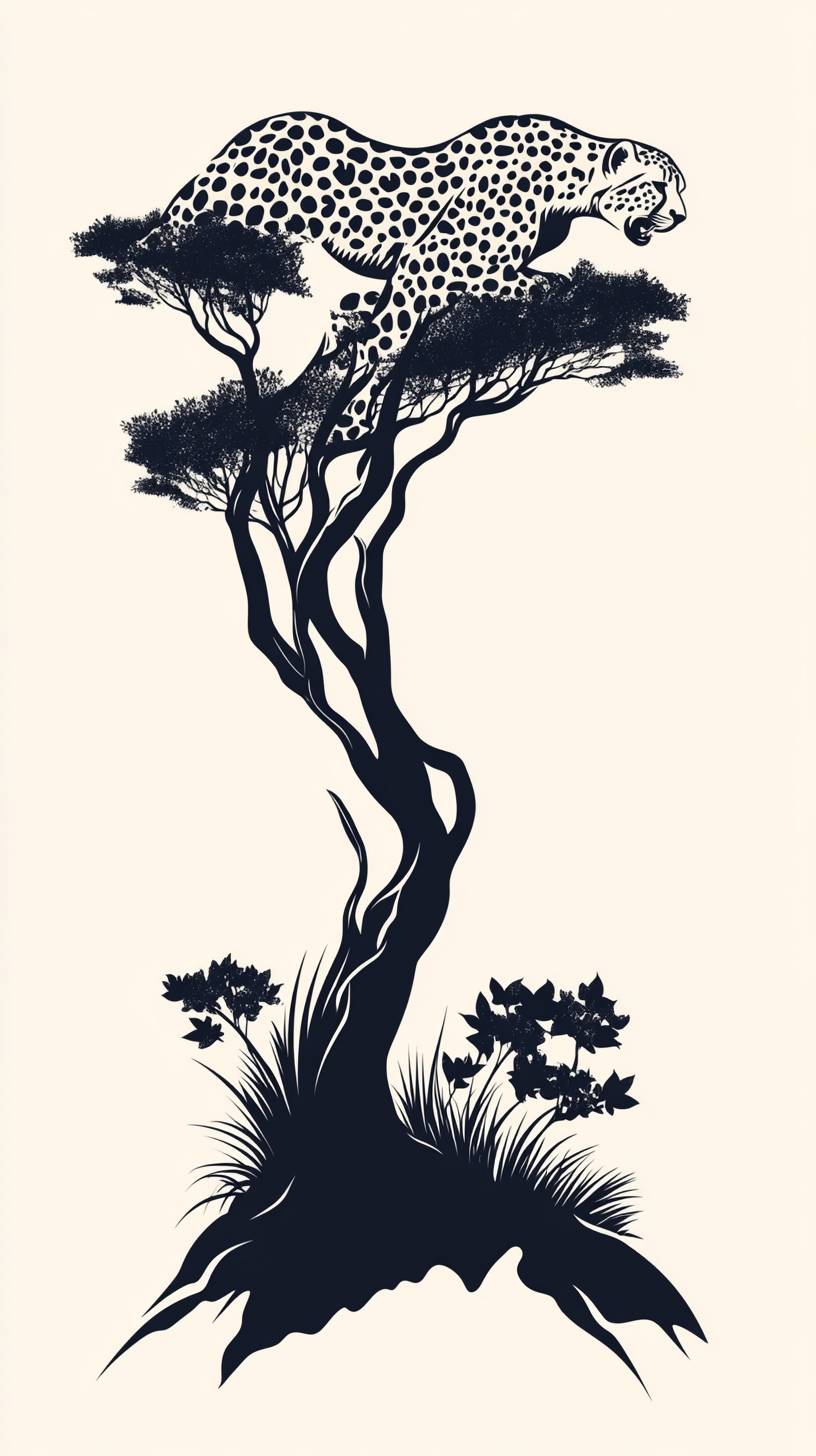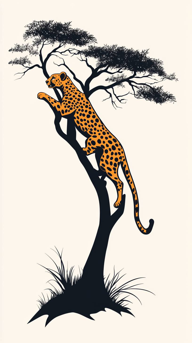 Elegant and minimalistic logo of a roaring cheetah climbing onto a tree. The design should have a modern style, with a focus on simplicity and elegance. The background is white. --ar 9:16 --stylize 250 --v 6.1