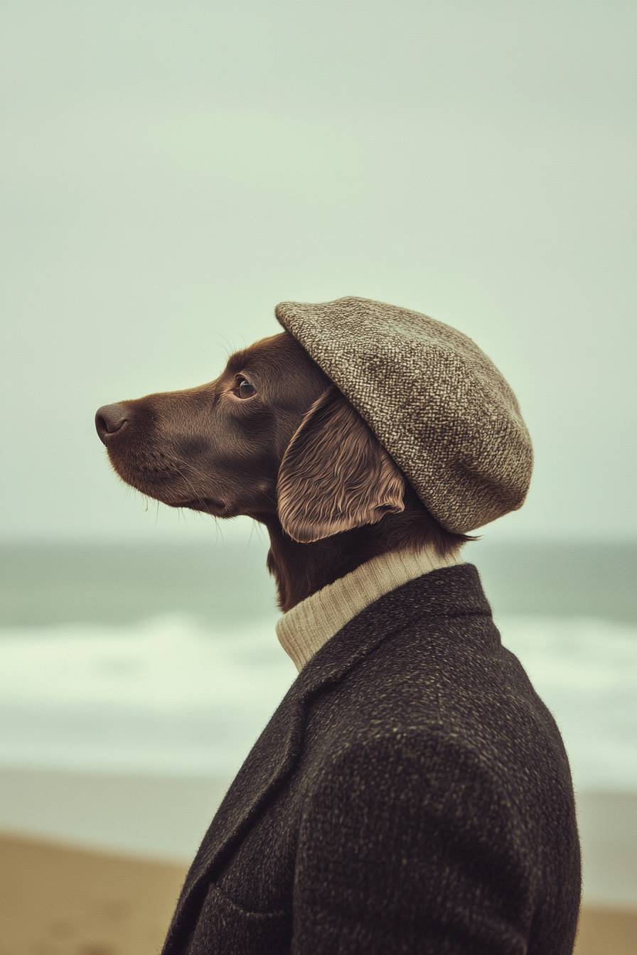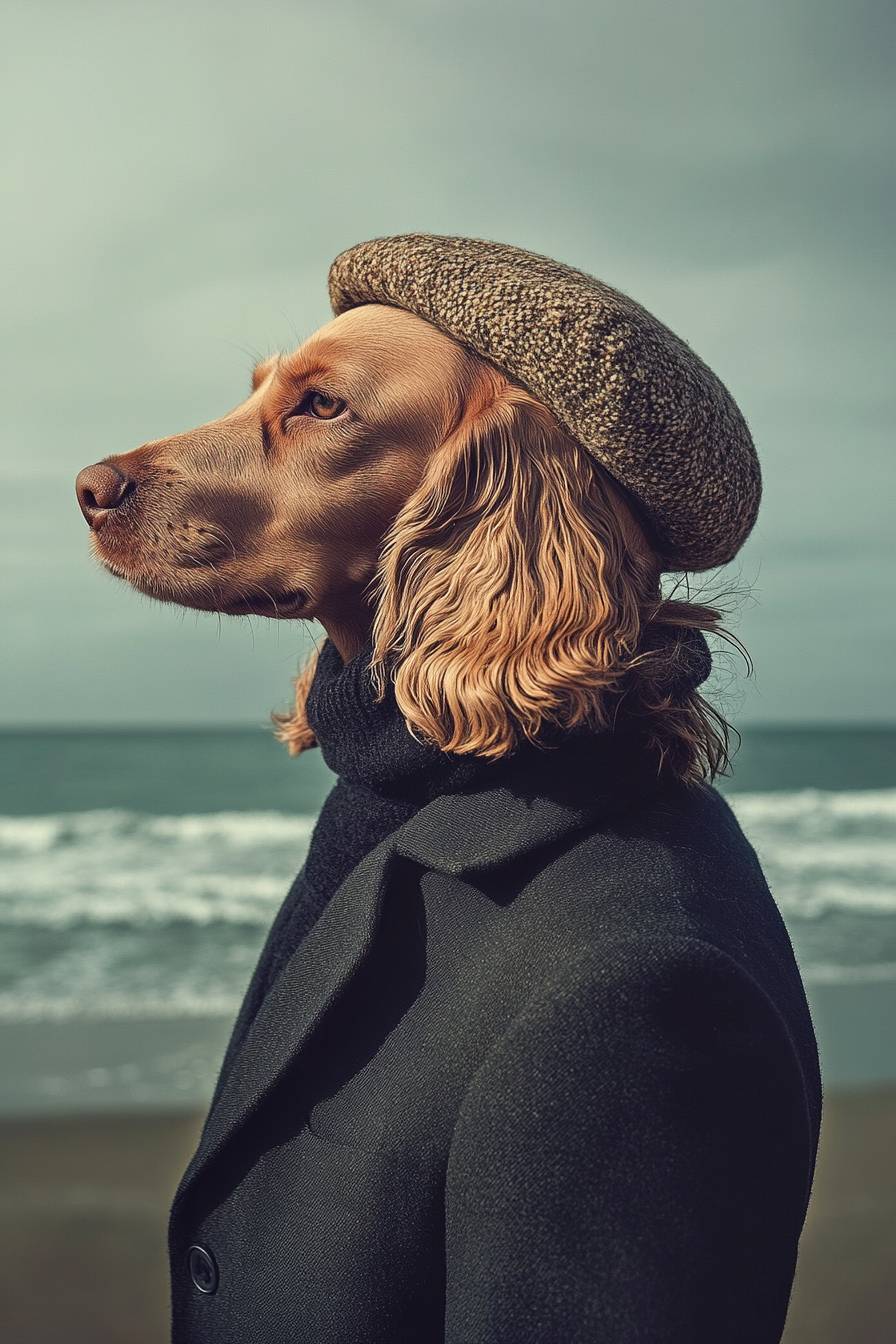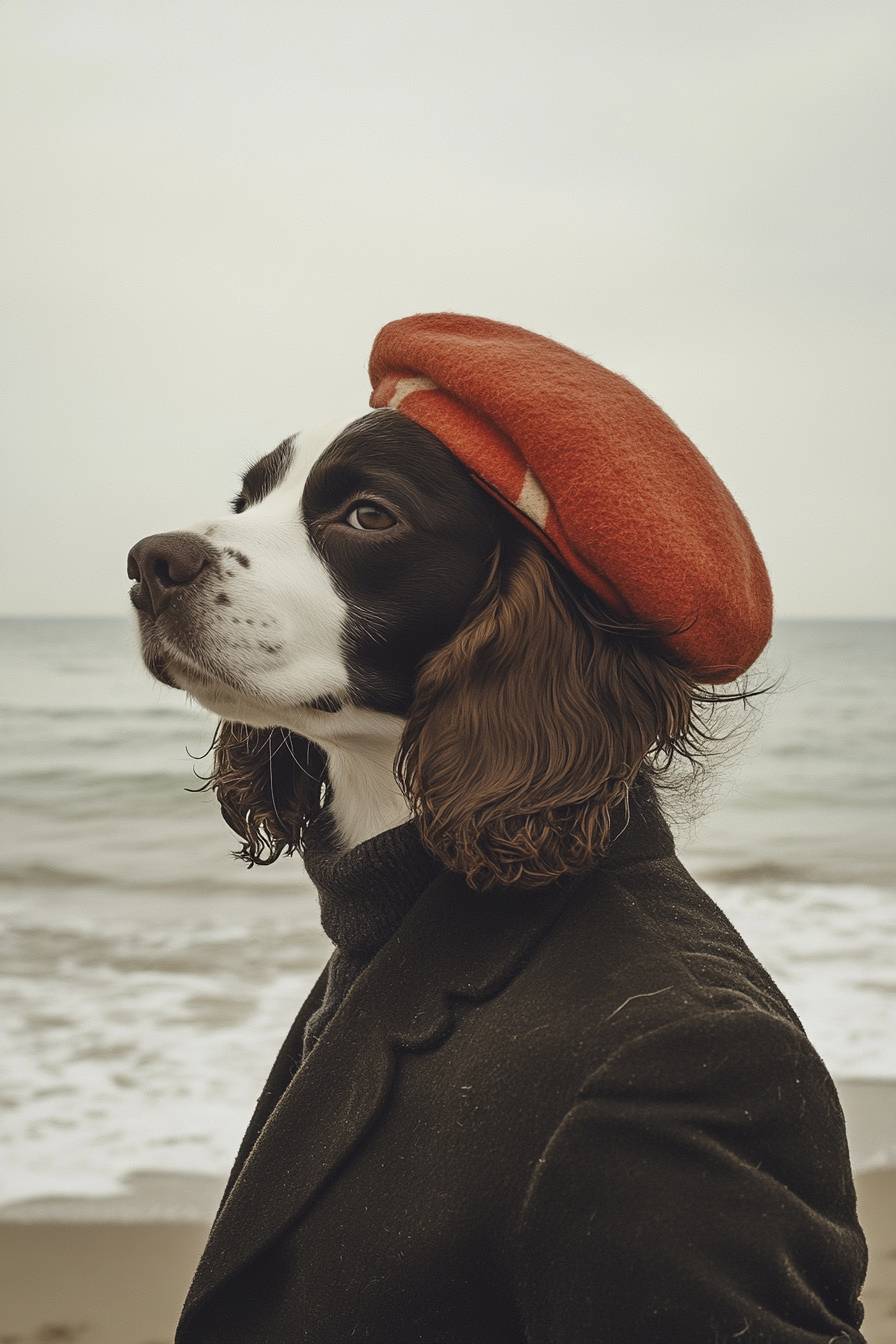 a spaniel dog's head on a man's body with a beret basque on the beach of Biarritz with a photographic style --ar 2:3 --v 6.1