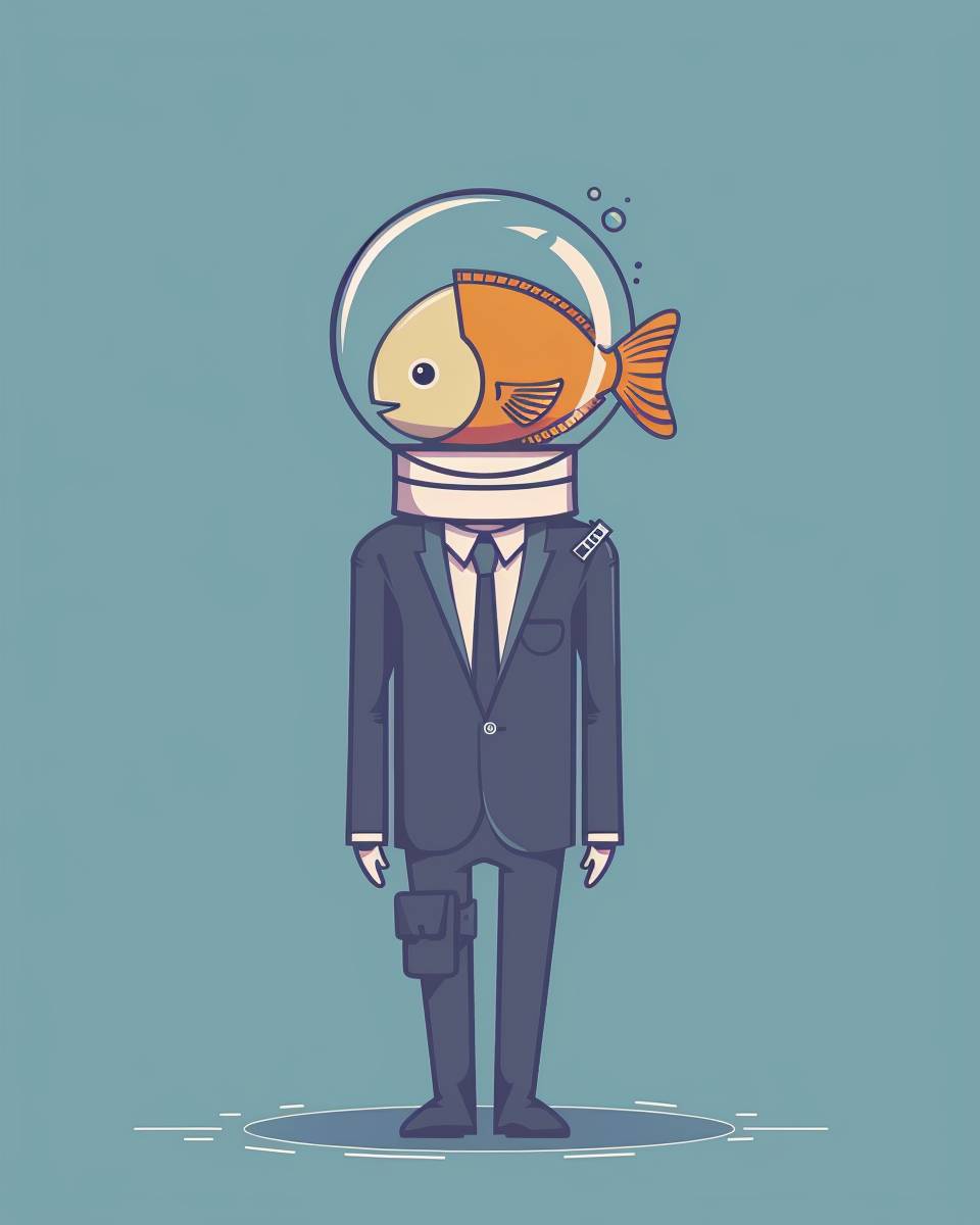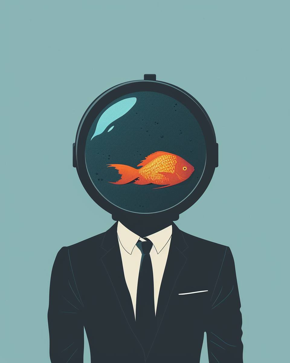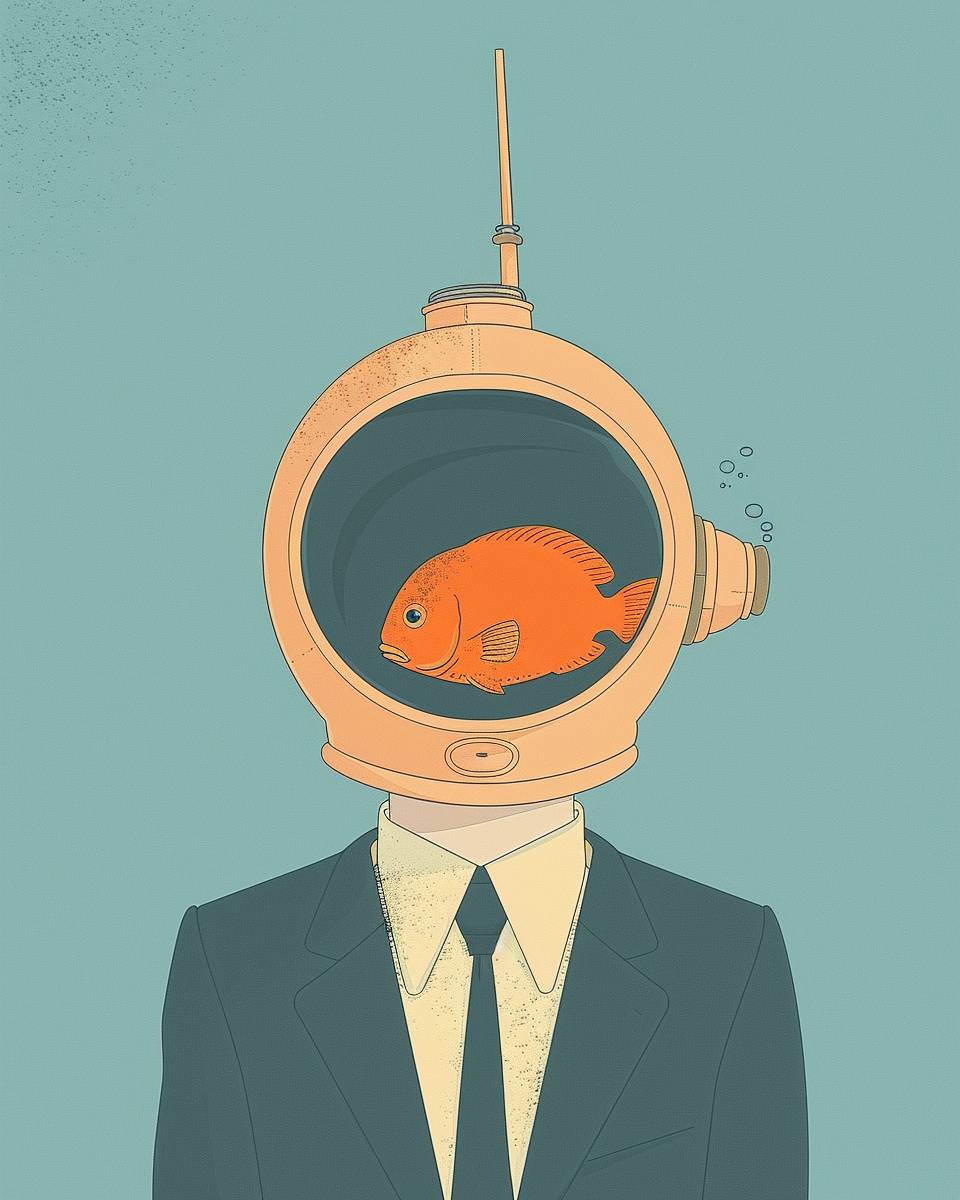 Eine einfache Illustration eines Mannes im Anzug und mit Krawatte, der einen Taucherhelm mit einem orangefarbenen Fisch darin trägt. Der Hintergrund ist pastellblau und im minimalistischen Stil.
