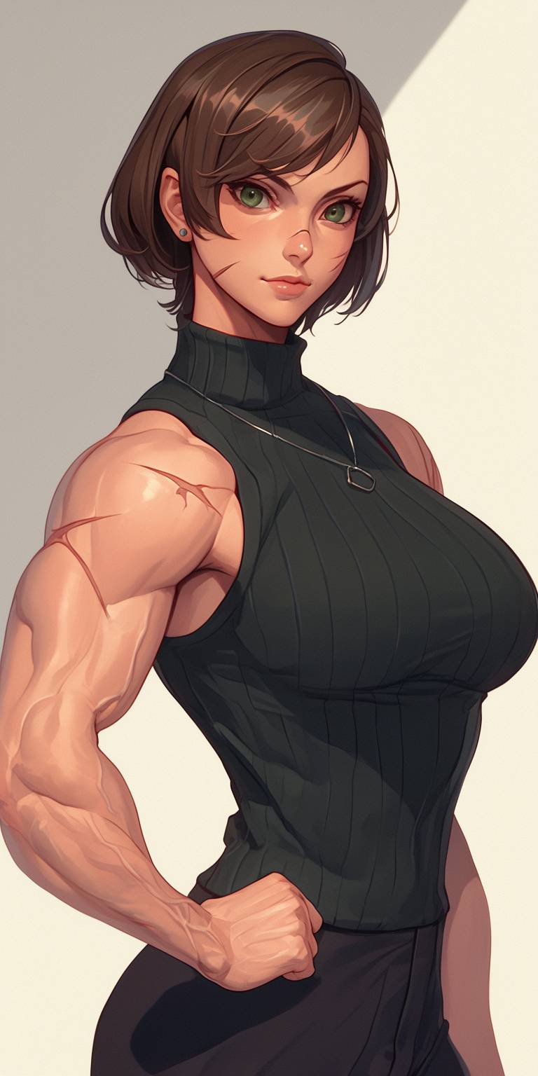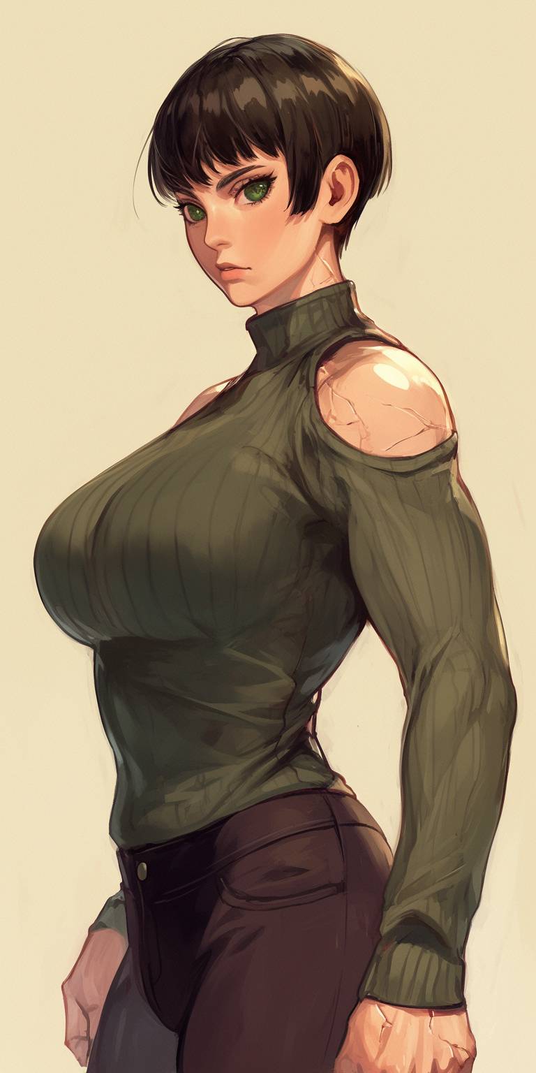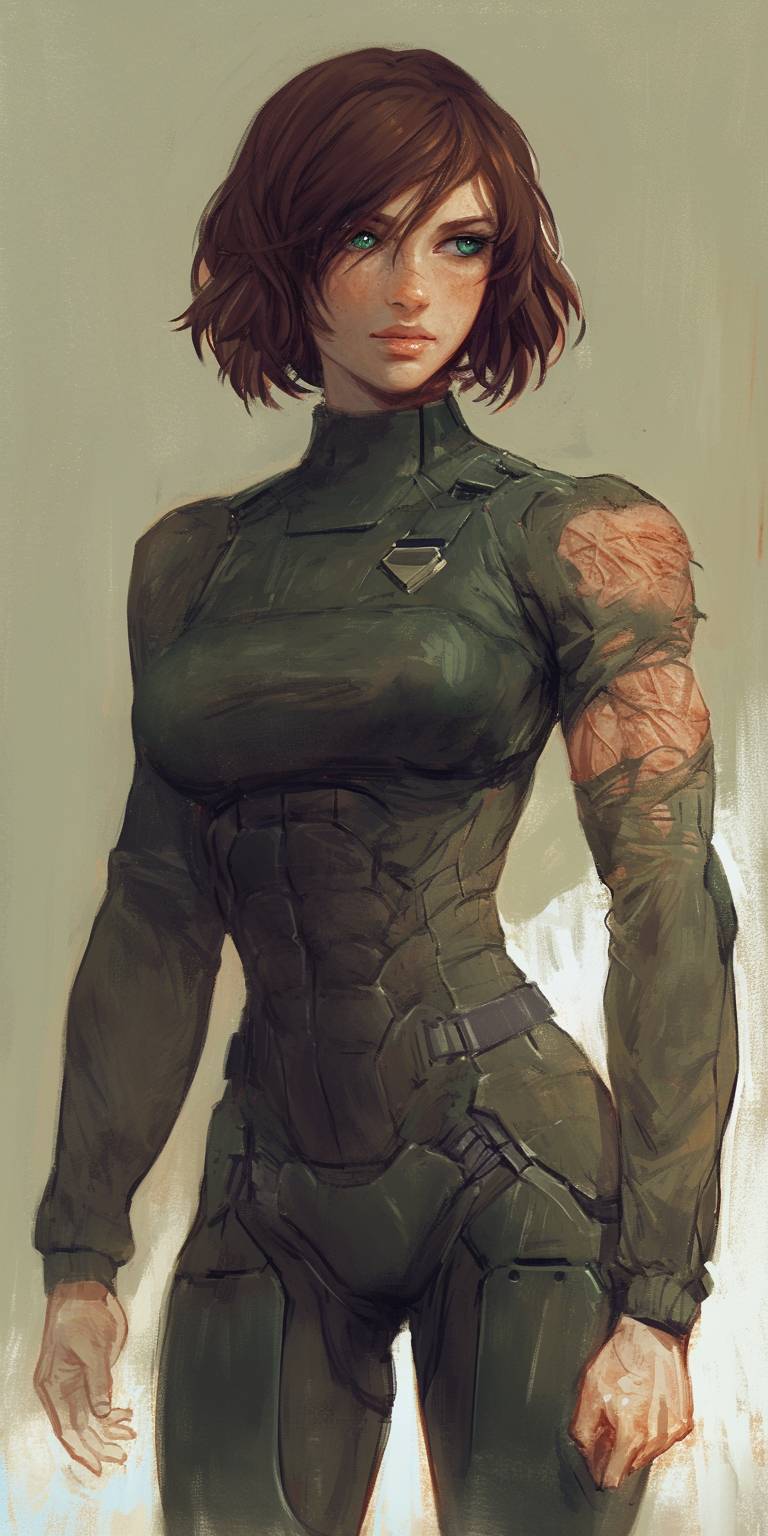 painting of a beautiful muscular woman with a short brown pixie cut and big green eyes, with extreme scars, UNSC marine soldier woman. Wearing a big knit sweater and tight pants --ar 1:2 --niji 6