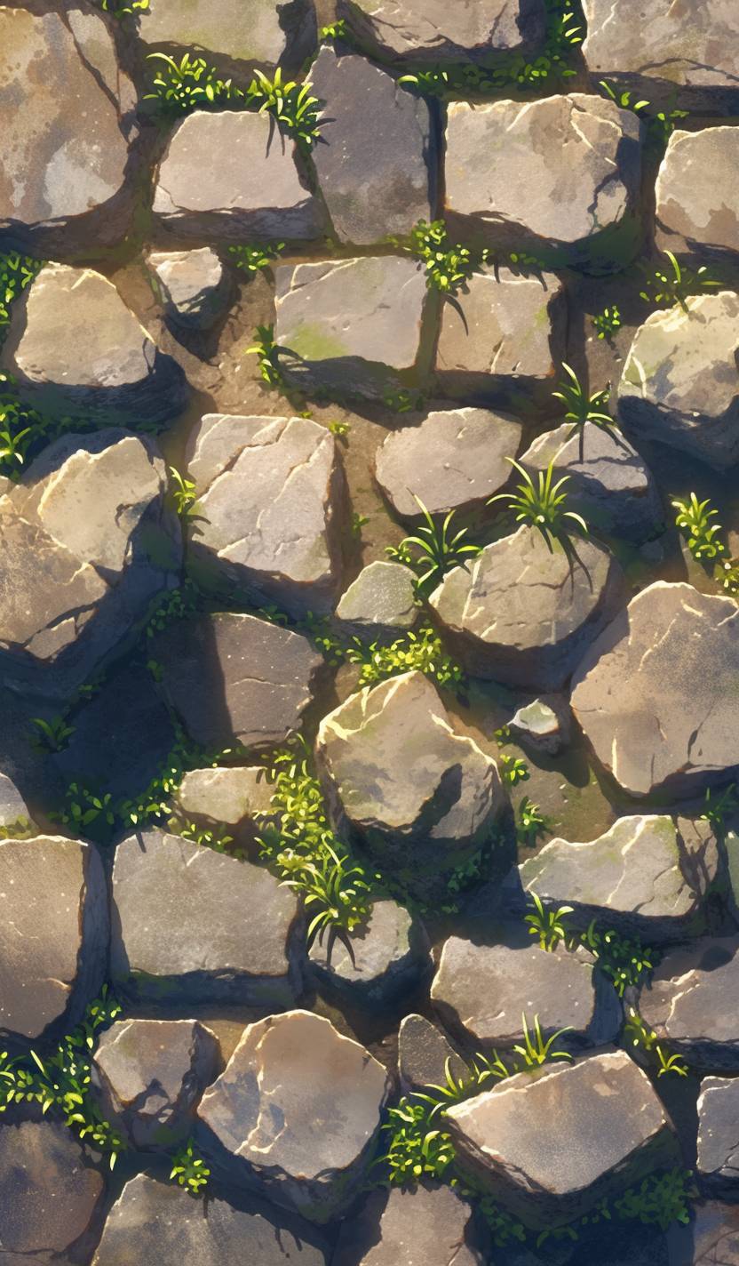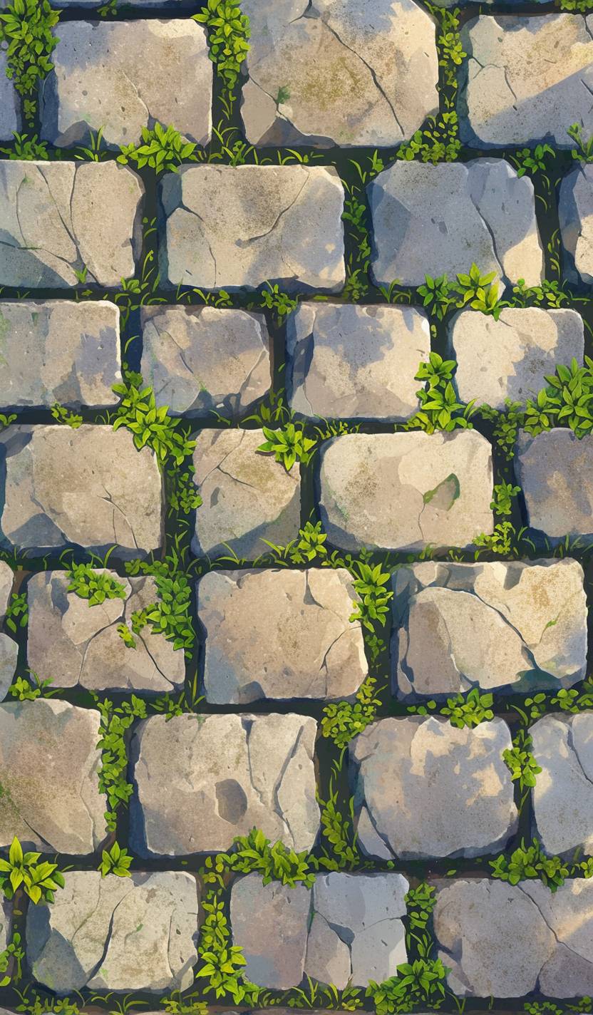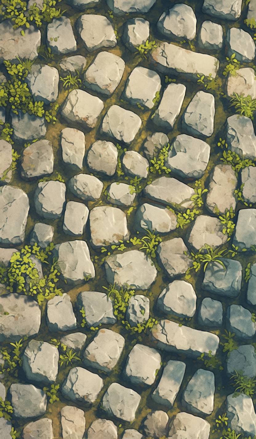 A top-down view of an old cobblestone road with grass growing between the stones, high resolution, high detail, high quality, in the style of a realistic painting. --ar 75:128 --niji 6