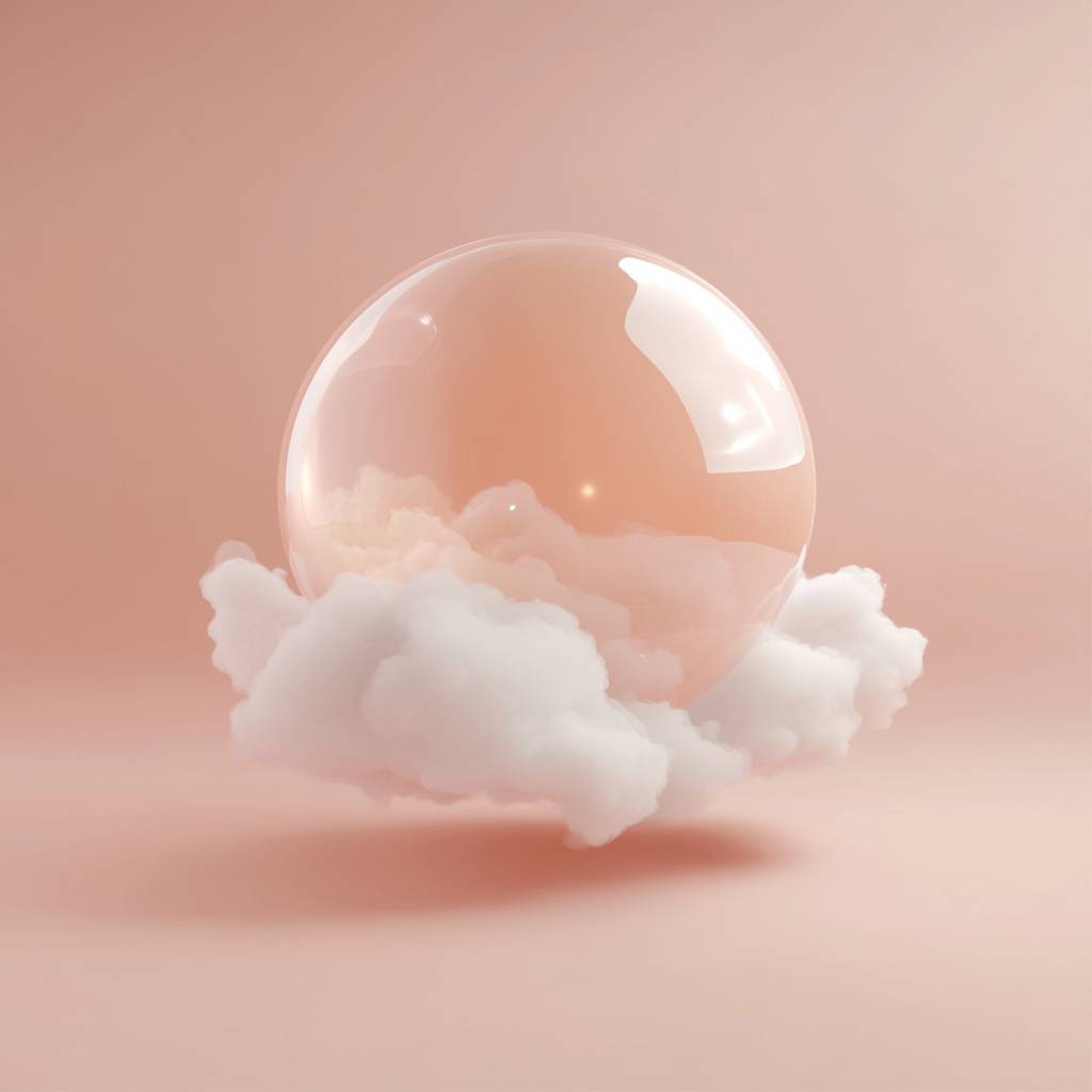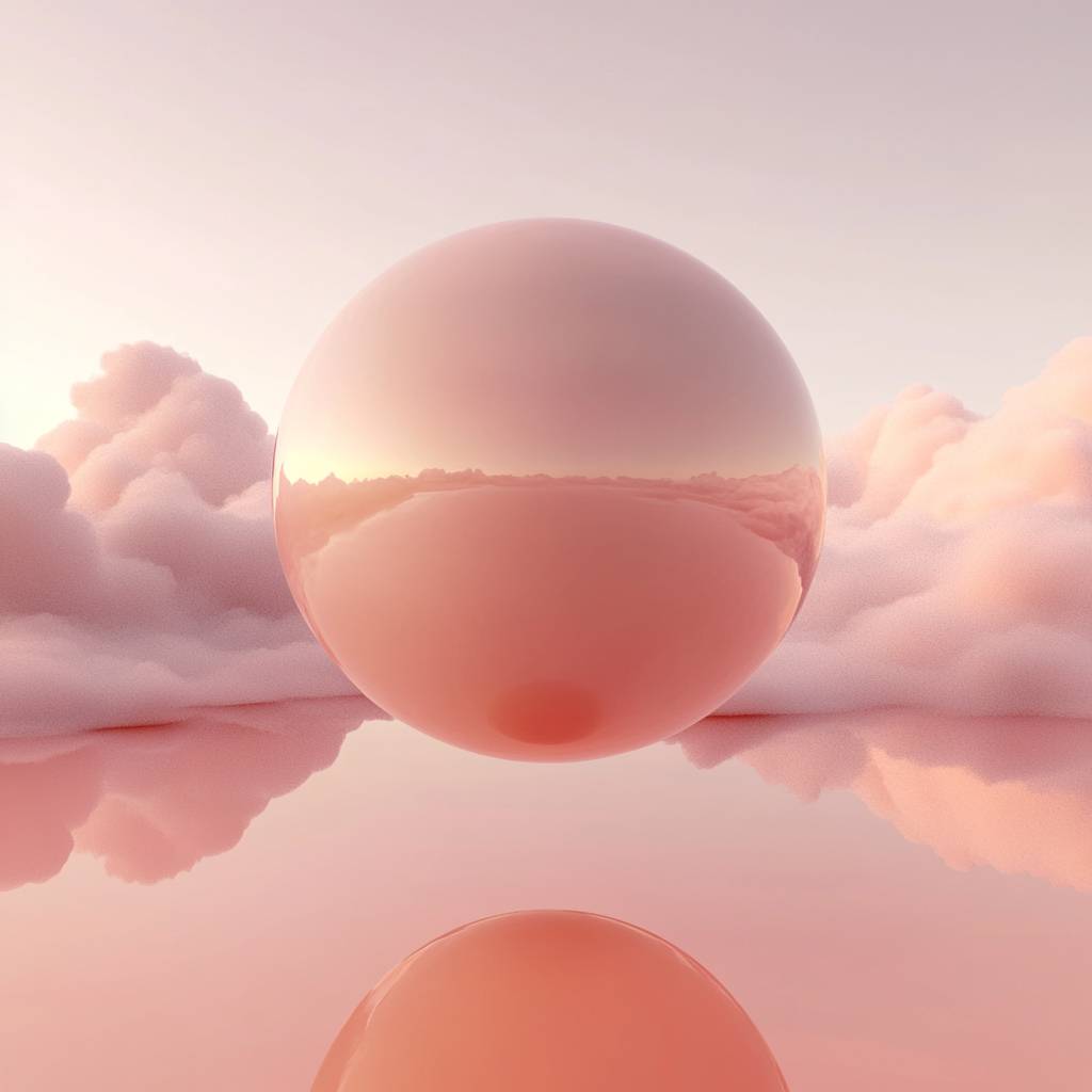 Ein 3D-Icon mit einer warmen Farbpalette, das eine schwebende, glänzende Kugel in sanften Rosa- und Pfirsichtönen zeigt, umgeben von einem subtilen Glühen und einer wolkenartigen Schwebebeschaffenheit um die Kugel, die Weichheit und Ruhe vermittelt. Glatte, kissenartige Texturen machen es ansprechend und modern, während sanfte Beleuchtung und Schatten Tiefe hinzufügen und das Icon hervorheben.
