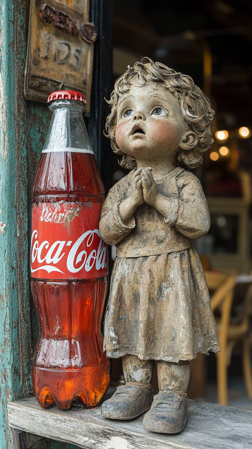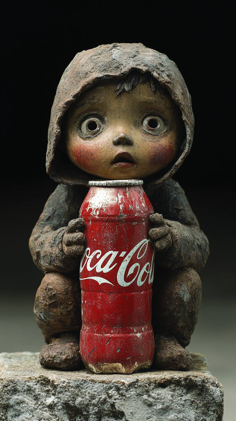 Ein ängstliches Erdenkind schaut auf Coca-Cola