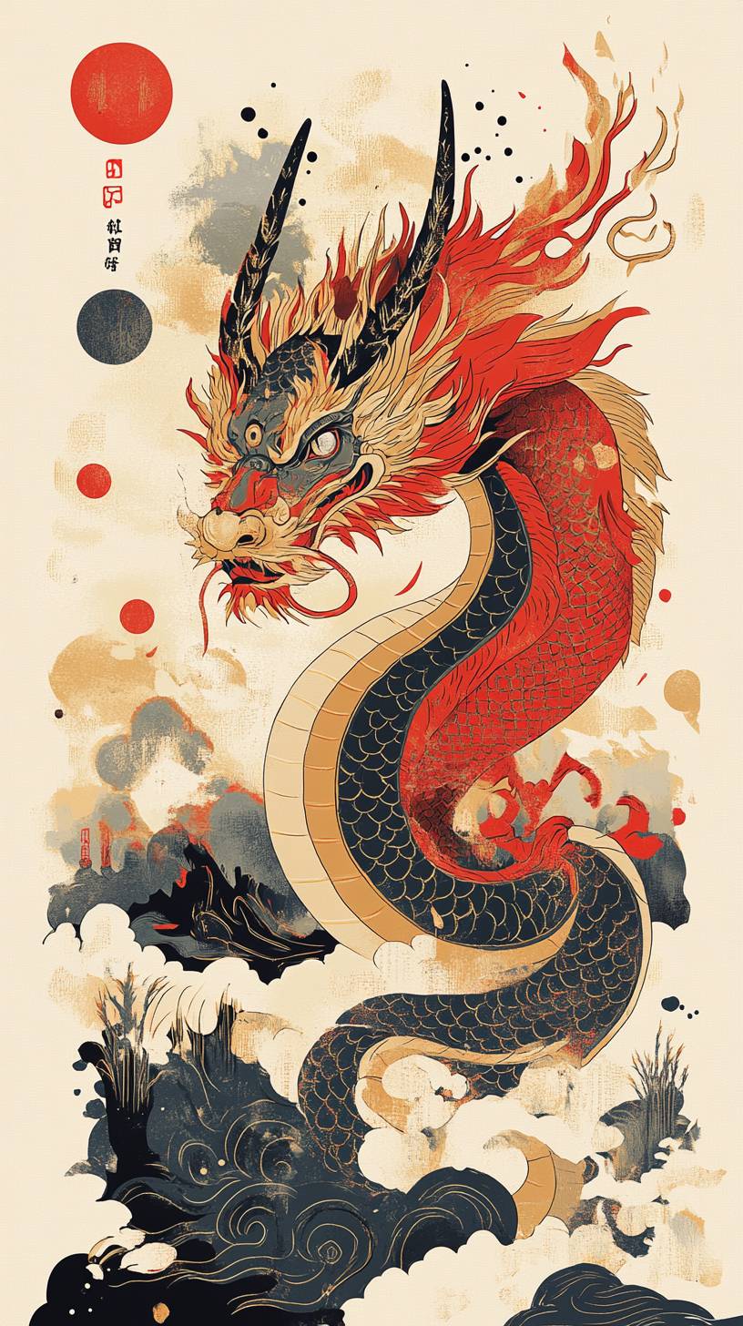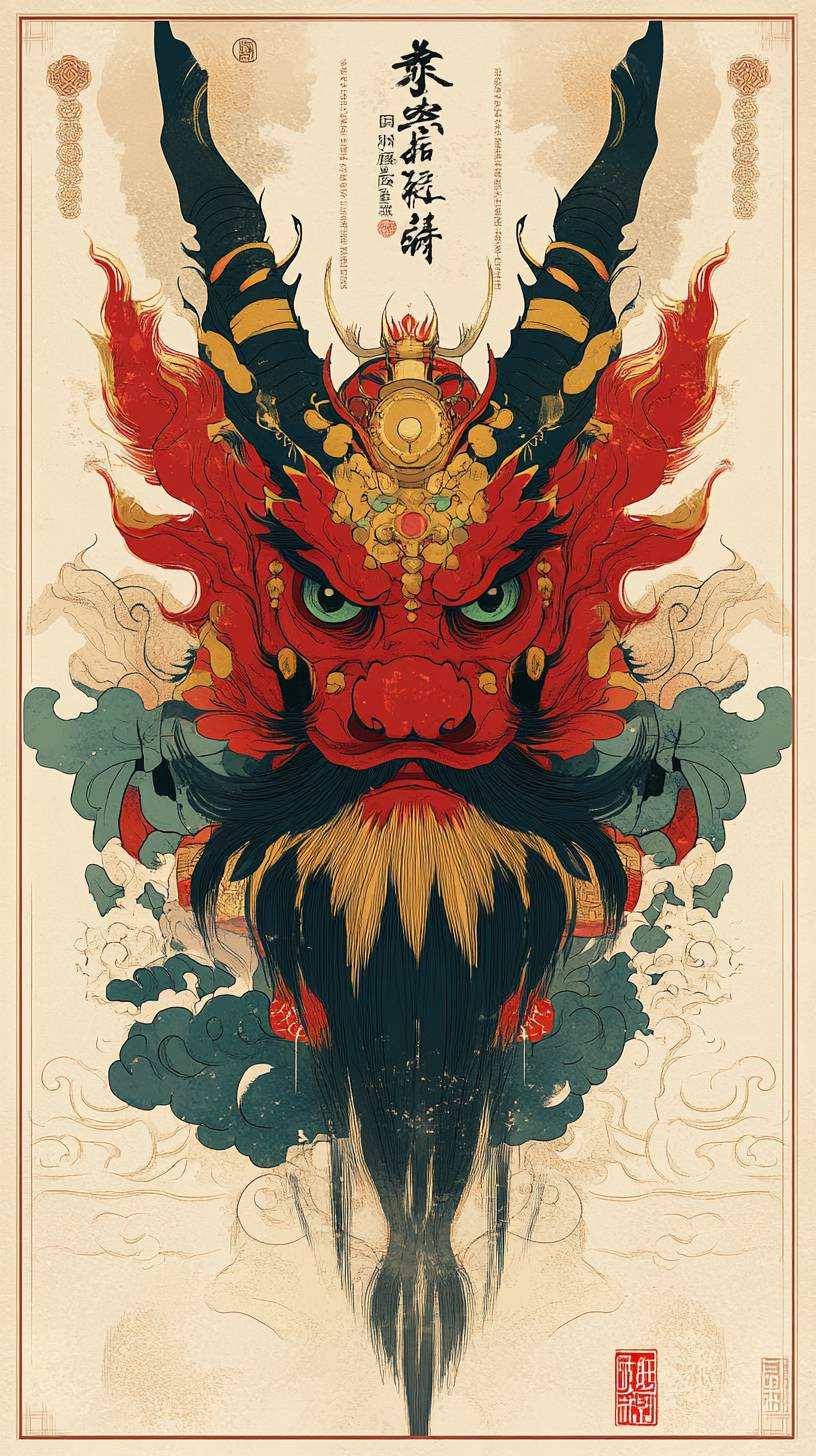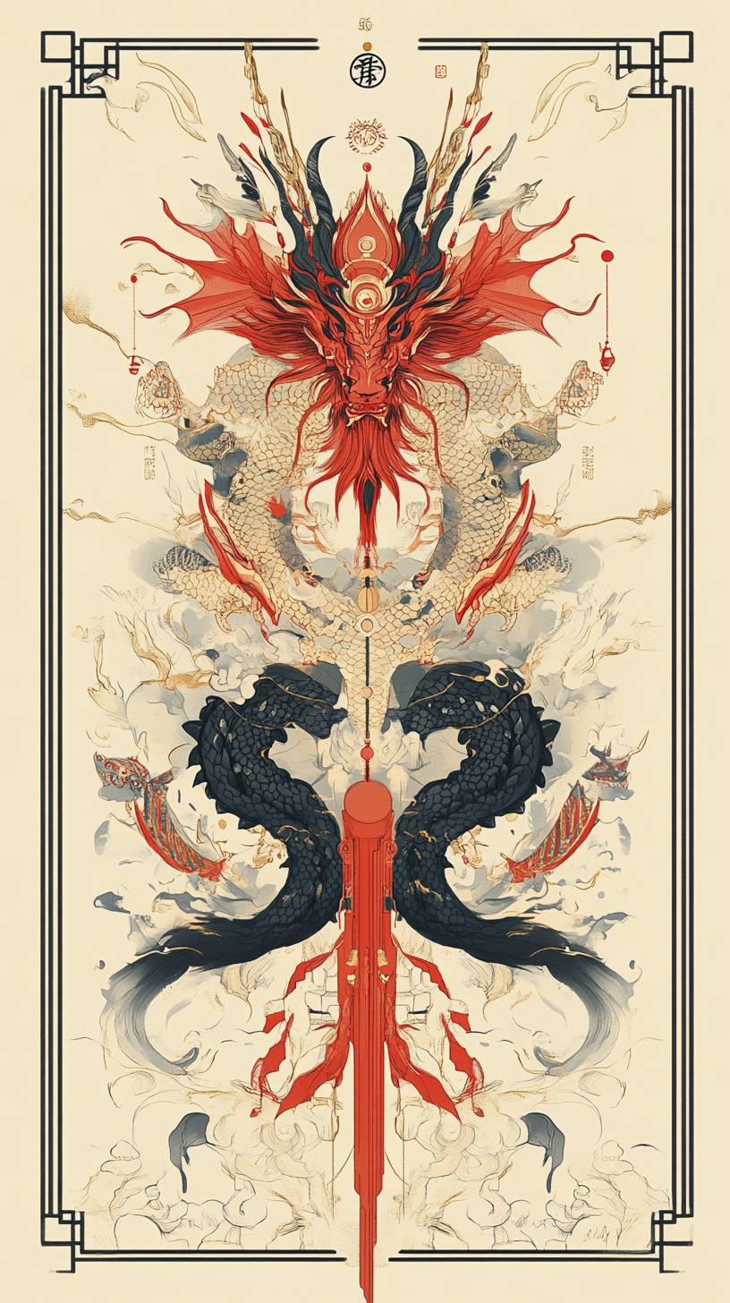Minimalist tarot card design ,An animal from the legend of Classic of Mountains and Seas,Set against the backdrop of minimalist tarot design. , Whole-body animal, traditional costumes and decorations, in a poster style, high resolution,A traditional Chinese-style print ,Chinese traditional mythical creature illustration,majestic atmosphere, in the style of traditional Chinese art.,The details are intricate, set against a Chinese ink painting background with traditional printmaking techniques, such as woodcut printing.The animal in Chinese mythology and legend, the Candle Dragon, has a red body and a human face with a snake body. It has both a human face and a snake body, with long, vertical eyes.The background is beige framed by black lines. --ar 9:16 --stylize 250 --v 6.1