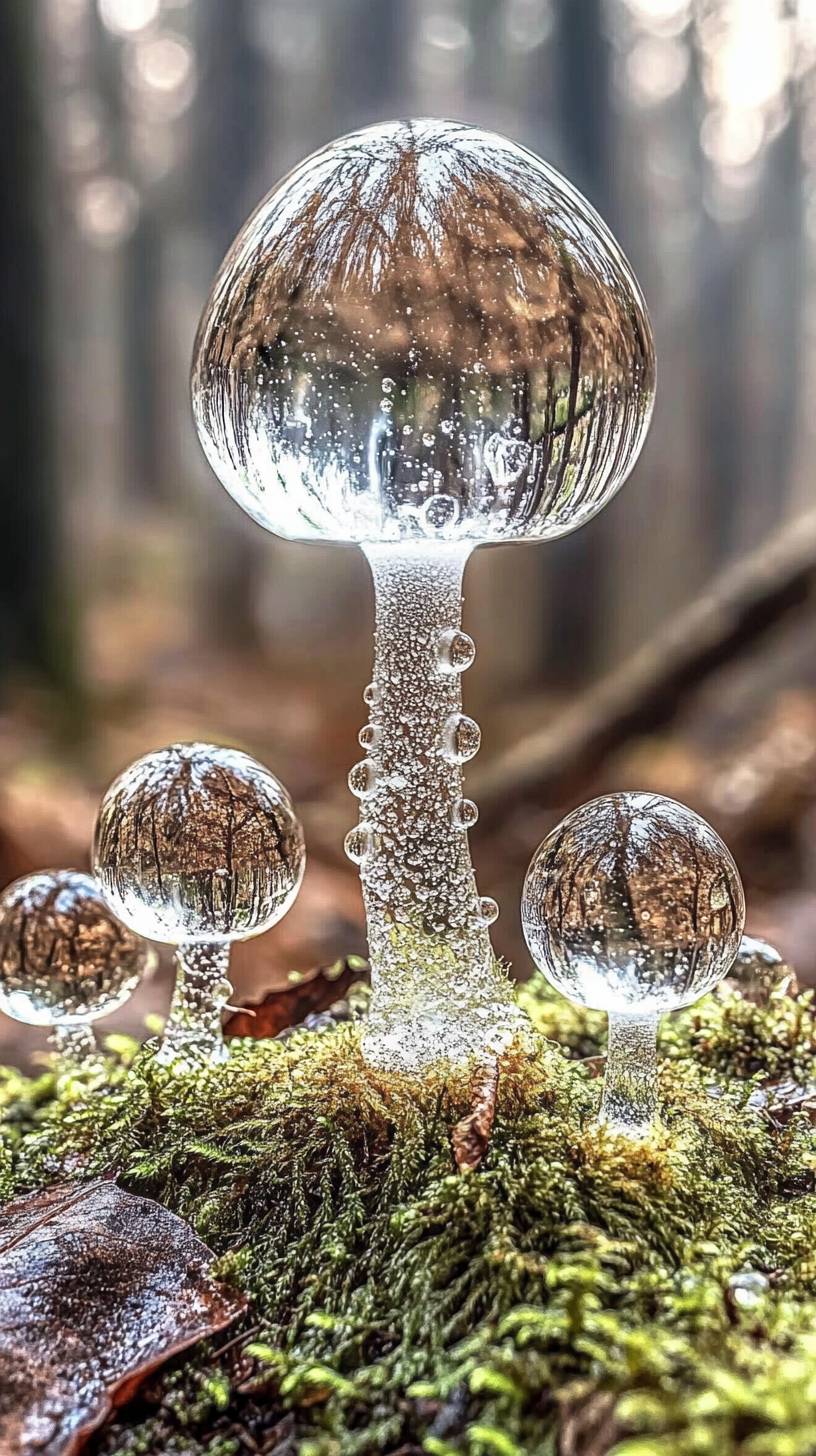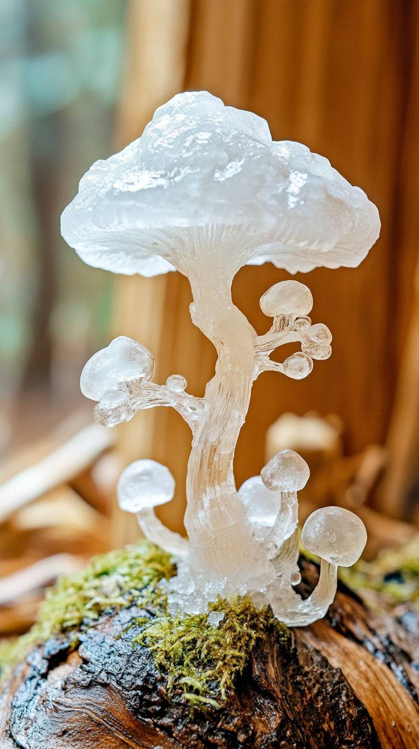 A hyperrealistic, ultra-close-up shot of a Galerina marginata mushroom made entirely from crystal, photographed with the best macro lens. The mushroom stands tall on mossy bark; The background shows a blurred, damp forest, enhancing the focus on the mushroom. Several smaller mushrooms, also formed from water, surround the central one, growing out of the soft moss. The scene captures the balance between the fragile droplets and the strength of nature, with every tiny bubble in perfect focus. --chaos 60 --ar 9:16 --stylize 200 --weird 400 --v 6.1