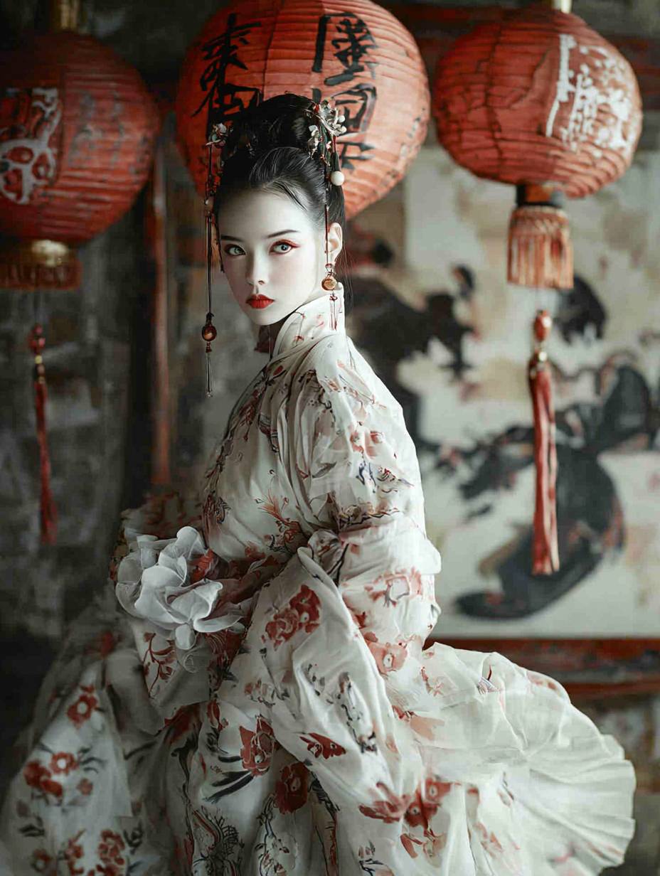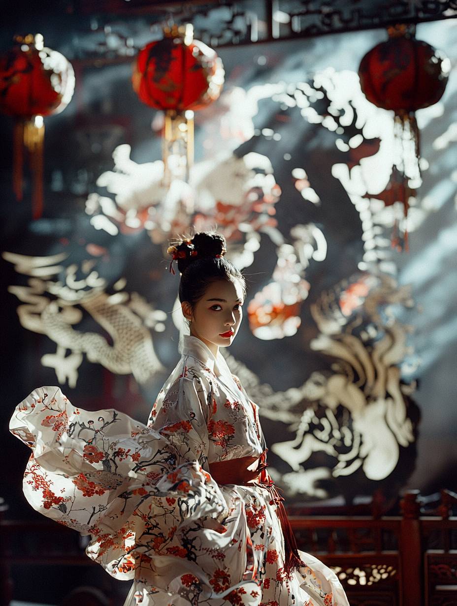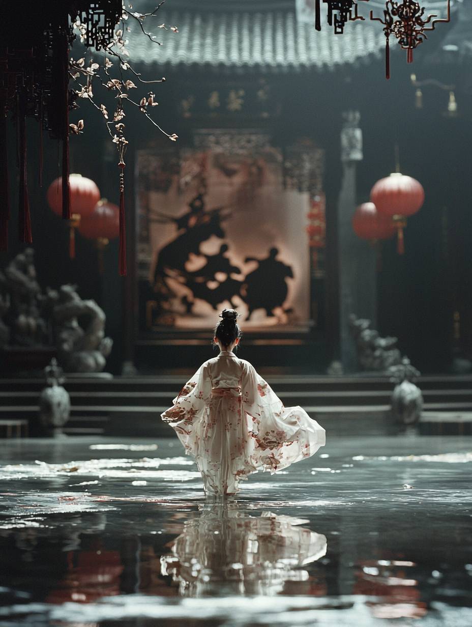 Frontansicht, ein 18-jähriges asiatisches Mädchen, das chinesische Kleidung trägt, steht auf einer traditionellen chinesischen Mahagonibühne. Hinter ihr befindet sich eine Schattenpuppenshow, wunderschön geschnitzt. Die Bühne ist mit klassischen Holzschnitzereien und Laternen dekoriert und spiegelt die traditionelle chinesische Schattenpuppenspielkunst wider. Ein erstaunlicher Shot, Minimalismus, Fluchtpunkt, Panorama, mehrere Aktionen und Perspektiven, fotografiert von Tim Walker.