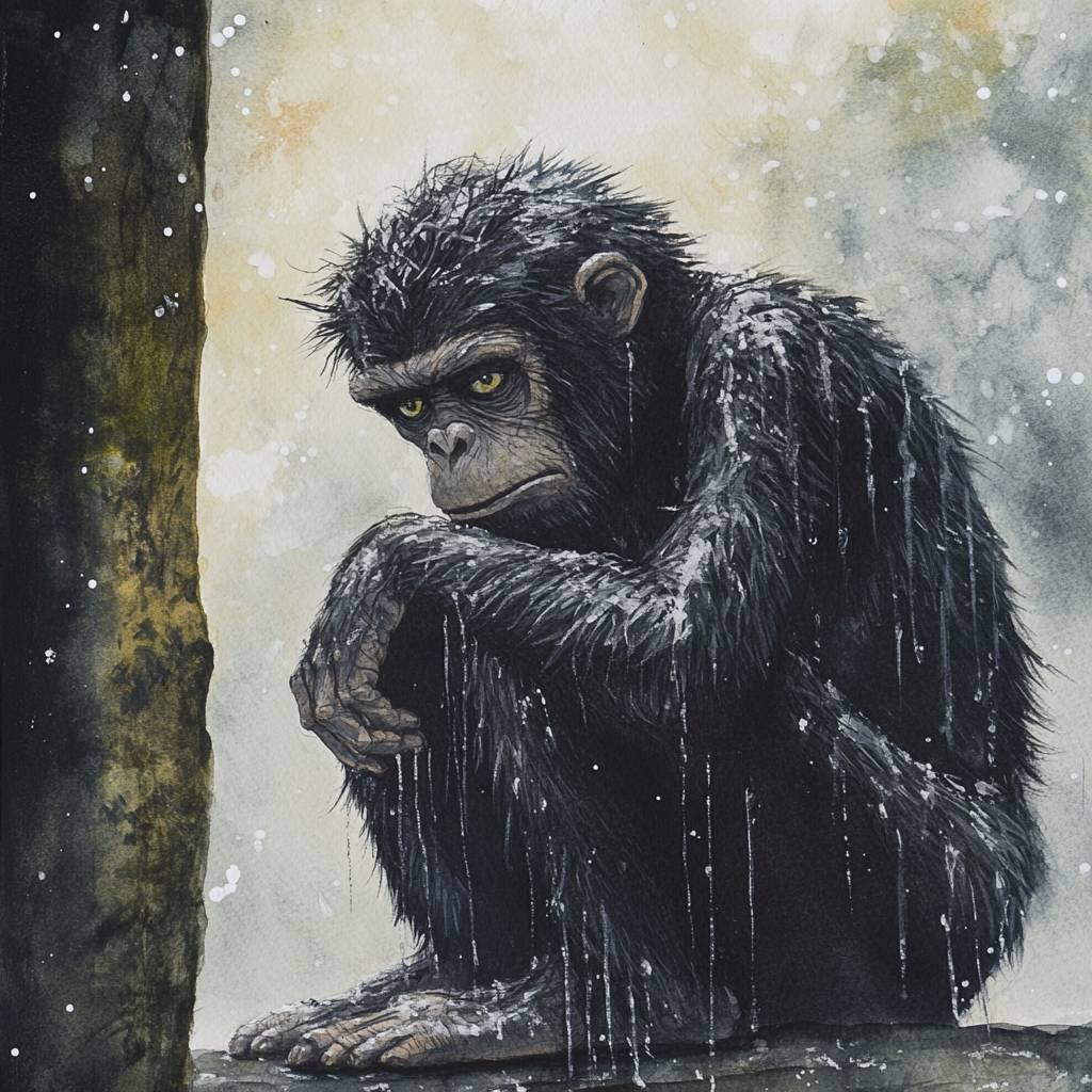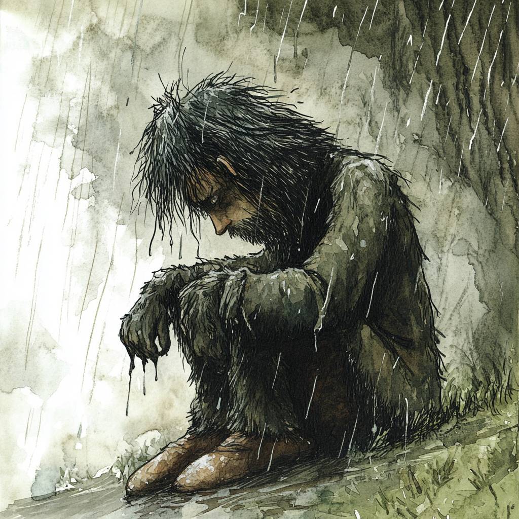 Eine detaillierte Aquarellzeichnung eines traurigen, nassen Wesens im Regen.