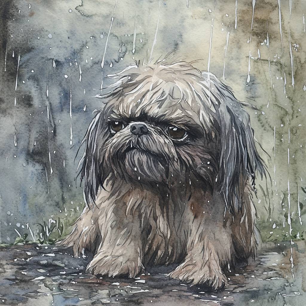 a detailed watercolor of a wet bedraggled hairy [SUBJECT] looking sad. Sitting outside in the heavy rain