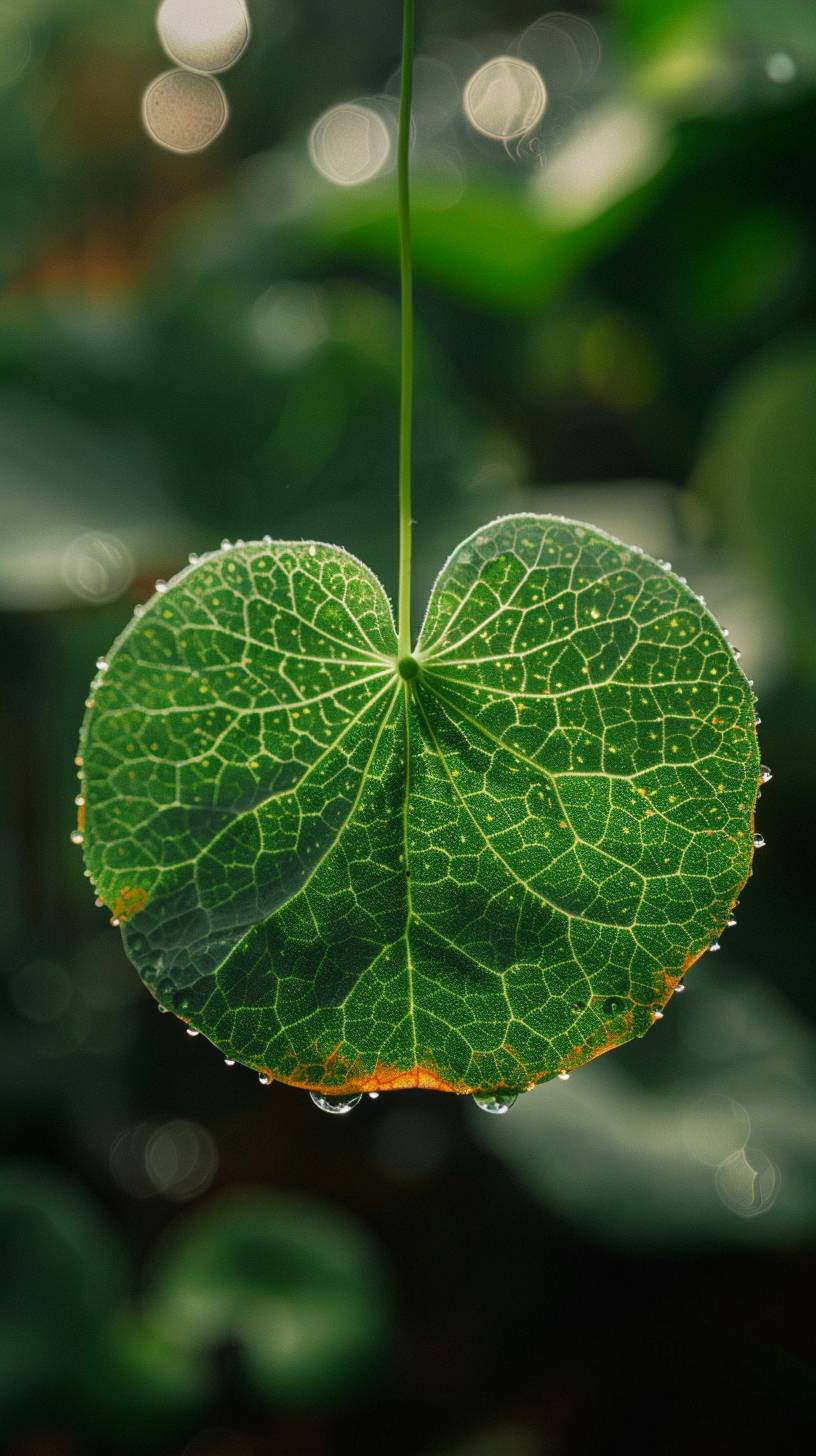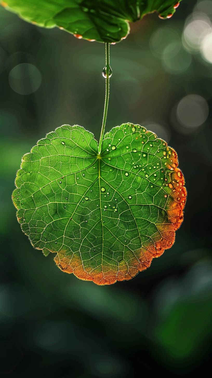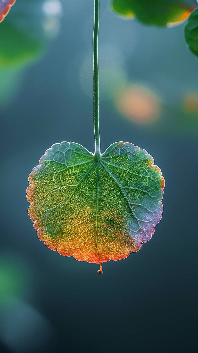 A leaf of Centella asiatica hangs in the air, round and plump, green, orange and purple, ultra-high-definition visual effects, realistic, tender green background blur --ar 9:16 --stylize 250 --v 6.0