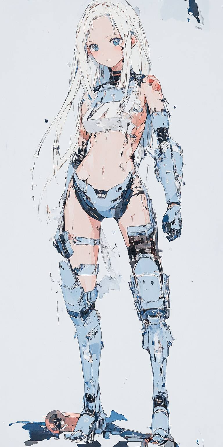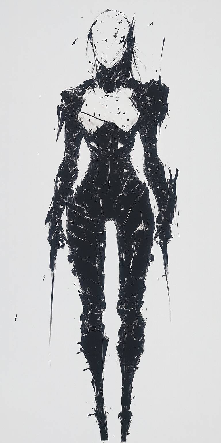 illustration of a photogram of an partially armored instagram model posing with metal armored plates on hips in the style of mecha anime --ar 1:2 --personalize xvedvui --stylize 166 --v 6.1
