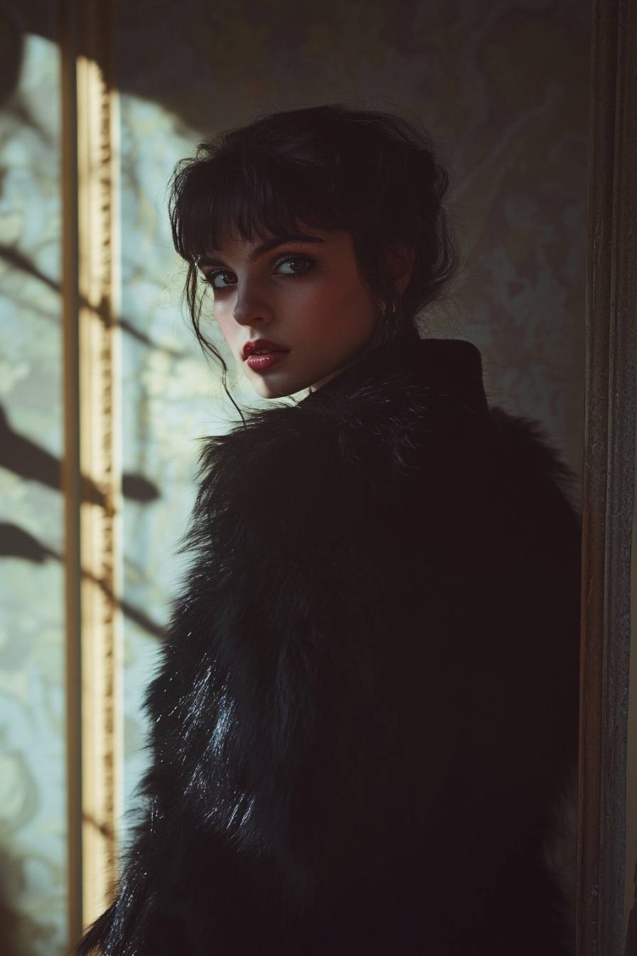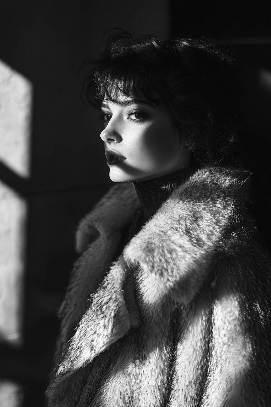 An enigmatic woman, reminiscent of Anna Karenina, stands draped in luxurious 1960s fur attire. She is captured in a dimly lit, moody setting, where long shadows fracture across the scene. The interplay of light and shadow hints at her inner turmoil and mystery. The soft fur contrasts with the sharp lines of broken light, while her distant gaze and poised figure evoke a sense of melancholy and quiet strength. Shot with natural soft light, the scene is rich in contrast, adding to the haunting, reflective atmosphere. --ar 2:3