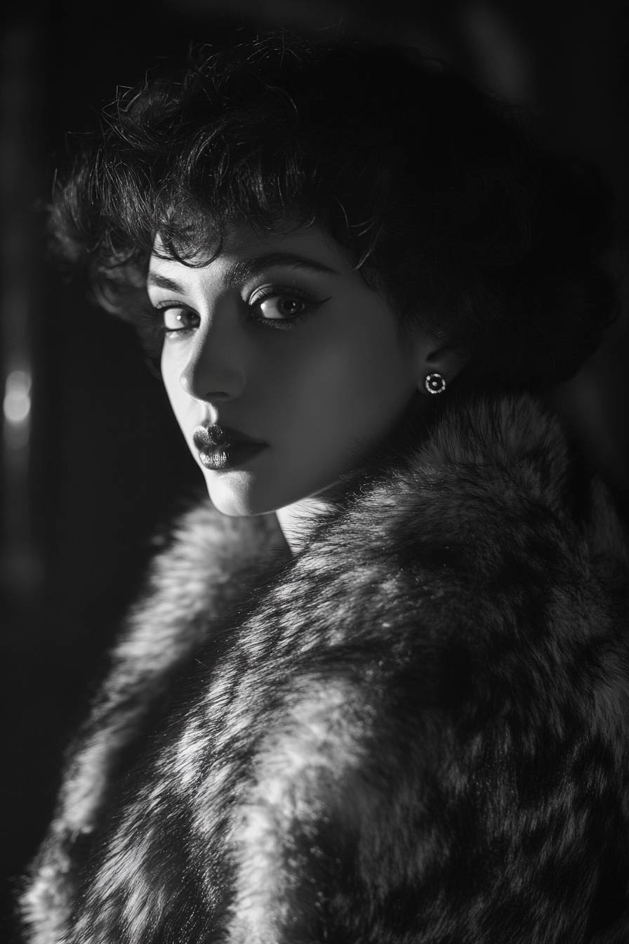 Eine rätselhafte Frau in luxuriöser Pelzkleidung der 1960er Jahre offenbart innere Unruhe und Stärke.