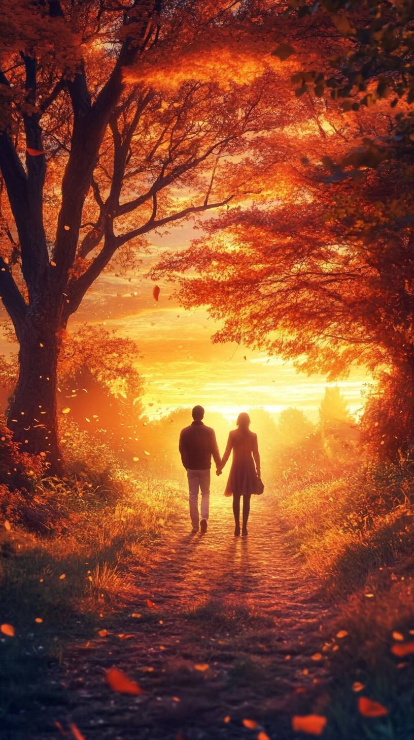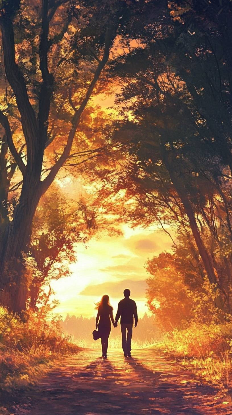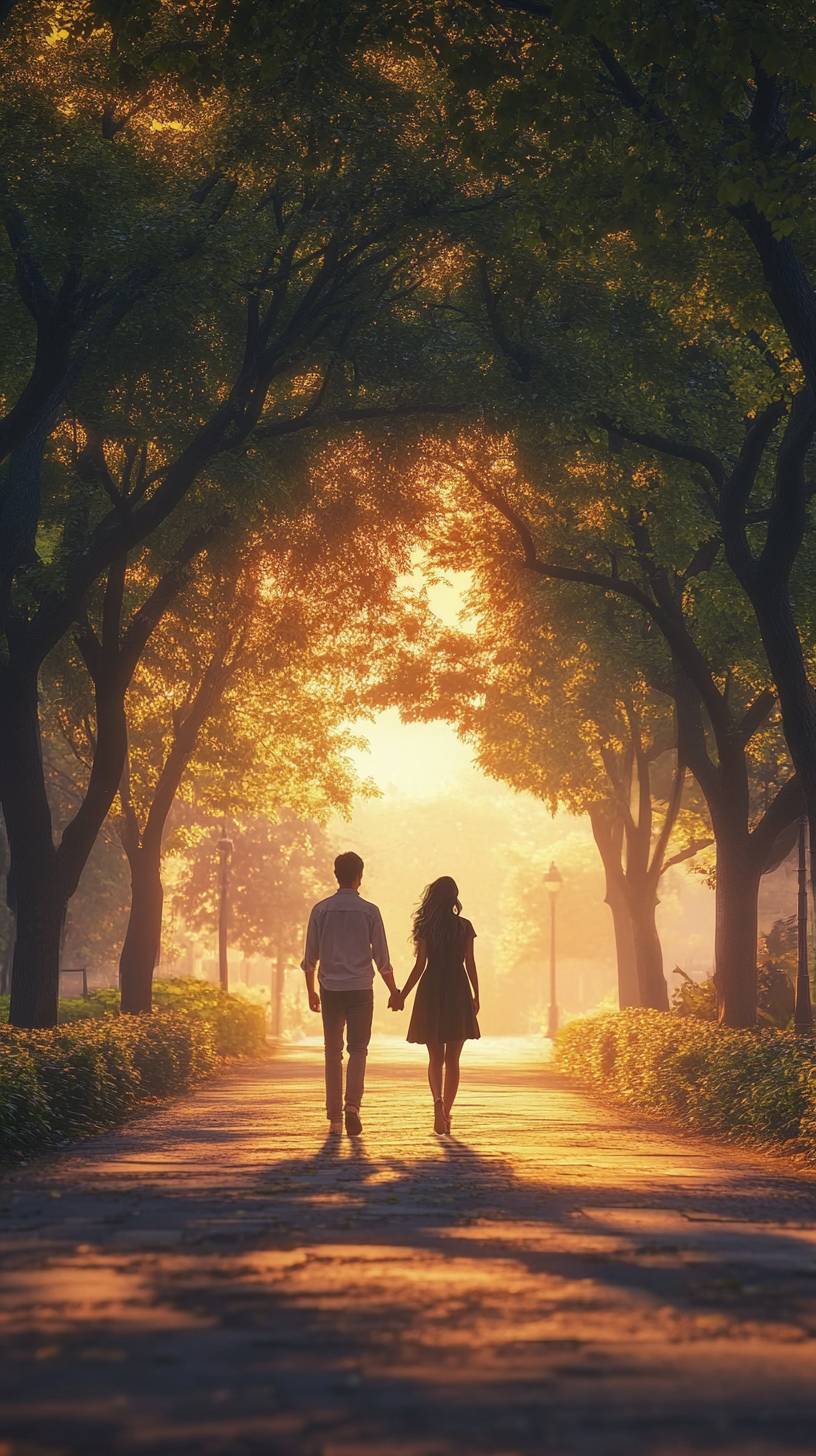 A couple walking hand in hand along the tree-lined path, the sunset scenery is picturesque, ultra-high-definition picture quality, realism, --ar 9:16 --v 6.1