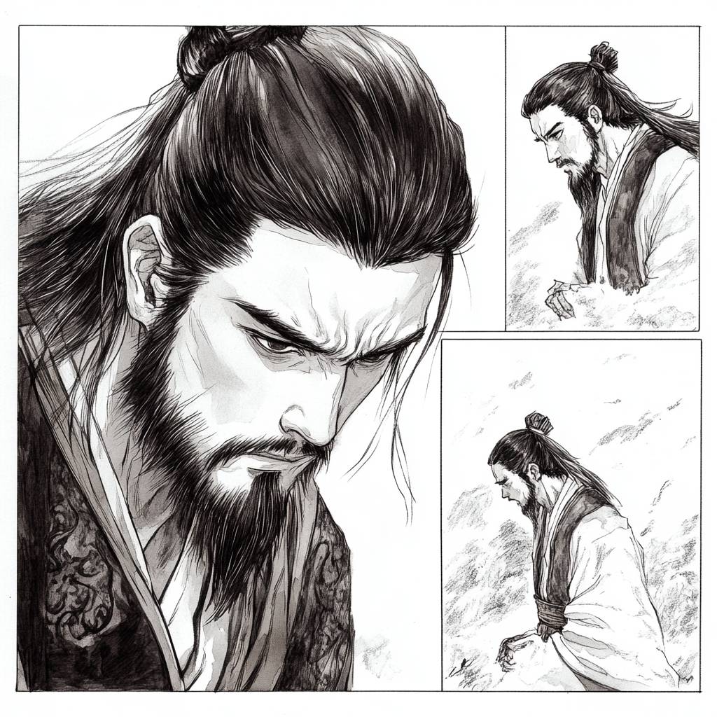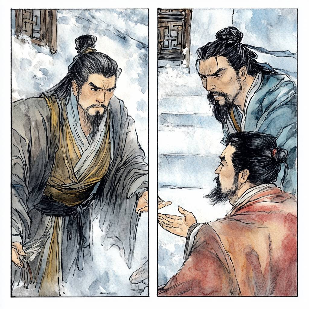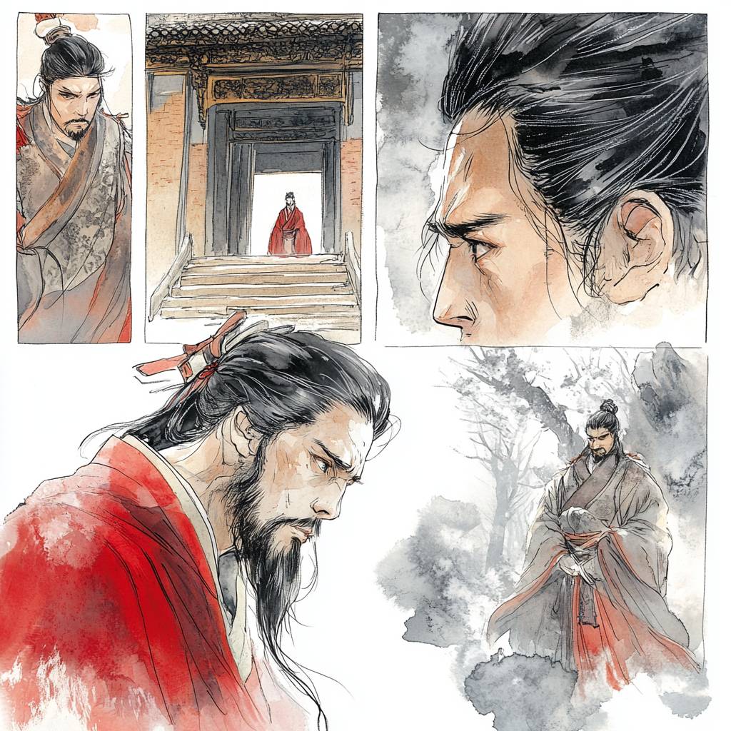 Midjourney4-panel traditional Chinese ink wash painting style comic, Warring States period. Muted tones, loose brushstrokes. Panel 1: Formal court scene, Lin's elevation. Panel 2: Tense standoff at Lin's gate. Panel 3: Lian Po's solitary contemplation. Panel 4: Symbolic gesture of forgiveness, Lian's humbling act. --personalize pcfu1aw --v 6.1