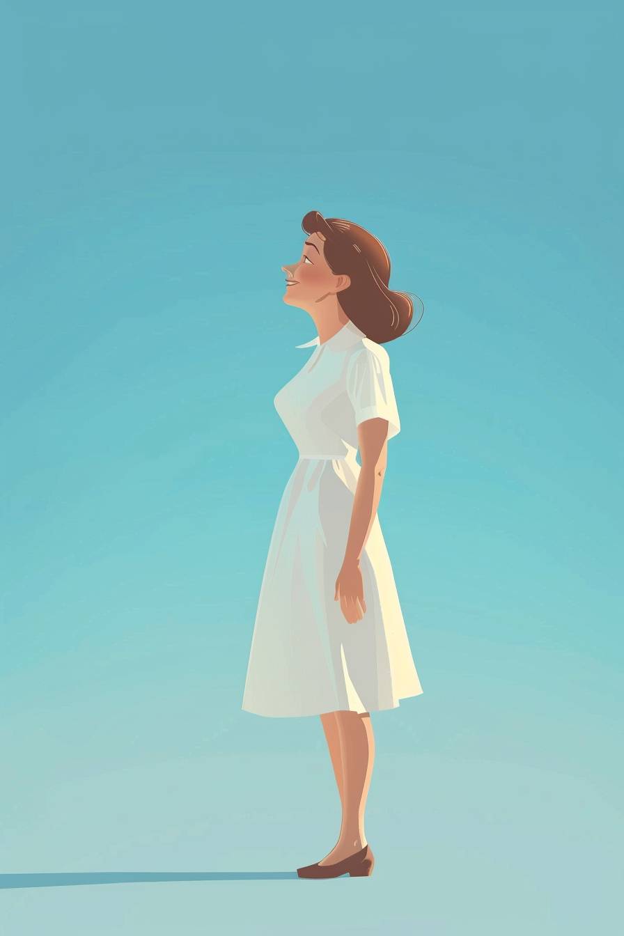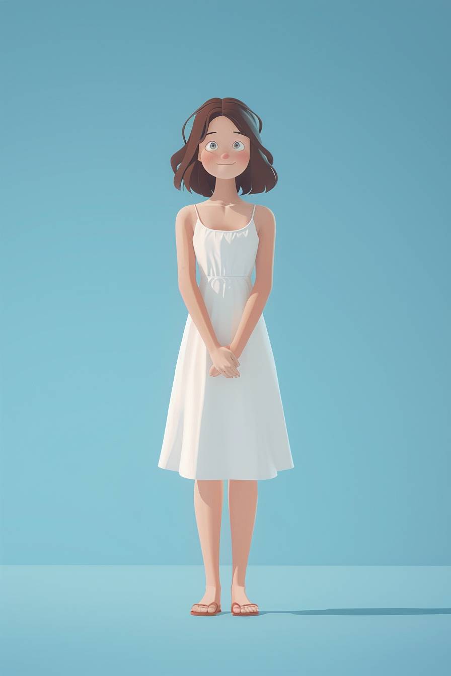 Pixar-Stil Animation einer lieben Mutter in einem einfachen Kleid, mit mittelbraunem Haar, die mit einem sanften Lächeln steht, Hintergrund einheitliches Himmelblau, ganzkörper, frontal, mütterlicher Pflege-Stil