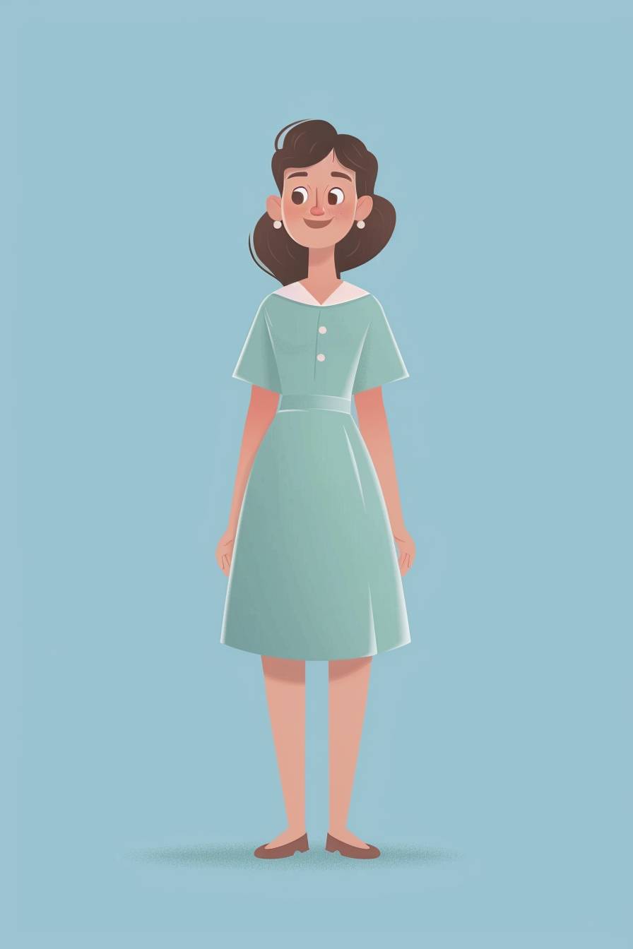 Pixar-style animation of, a lovely mom in a simple dress, with middle brown hair, standing with a gentle smile, background, solid sky blue, Full body, facing front, nurturing mother style --ar 2:3 --style raw --v 6.0
