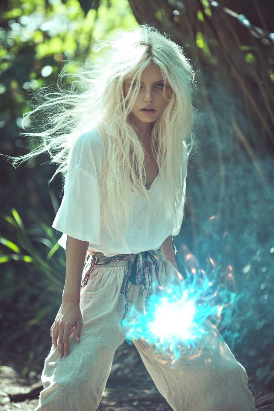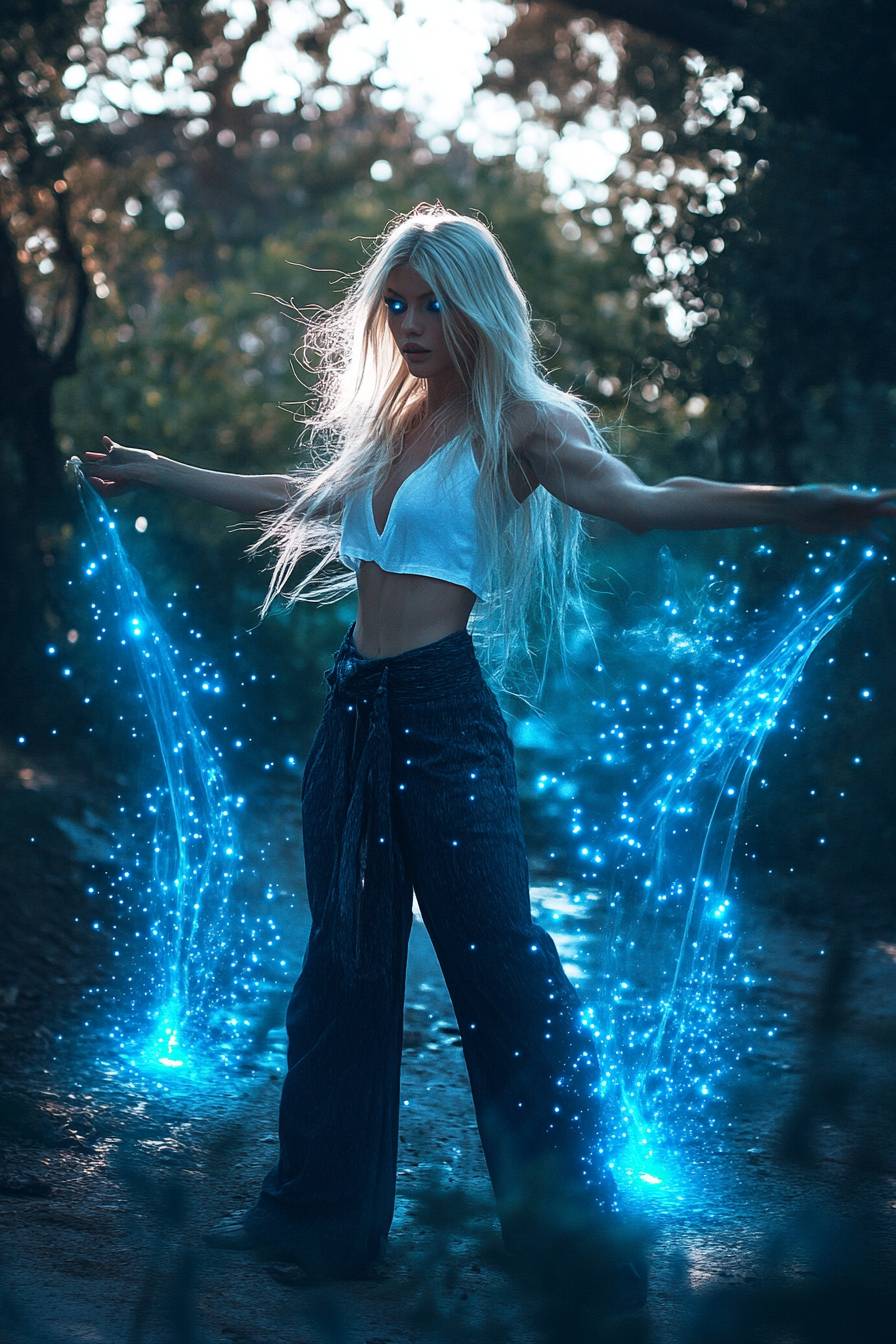 Taylor Momsen, blond, weite Hosen, weißes Hemd, plasmatische magische Leere Licht, Symbole, fließend, Biolumineszenz, Kick, im Freien
